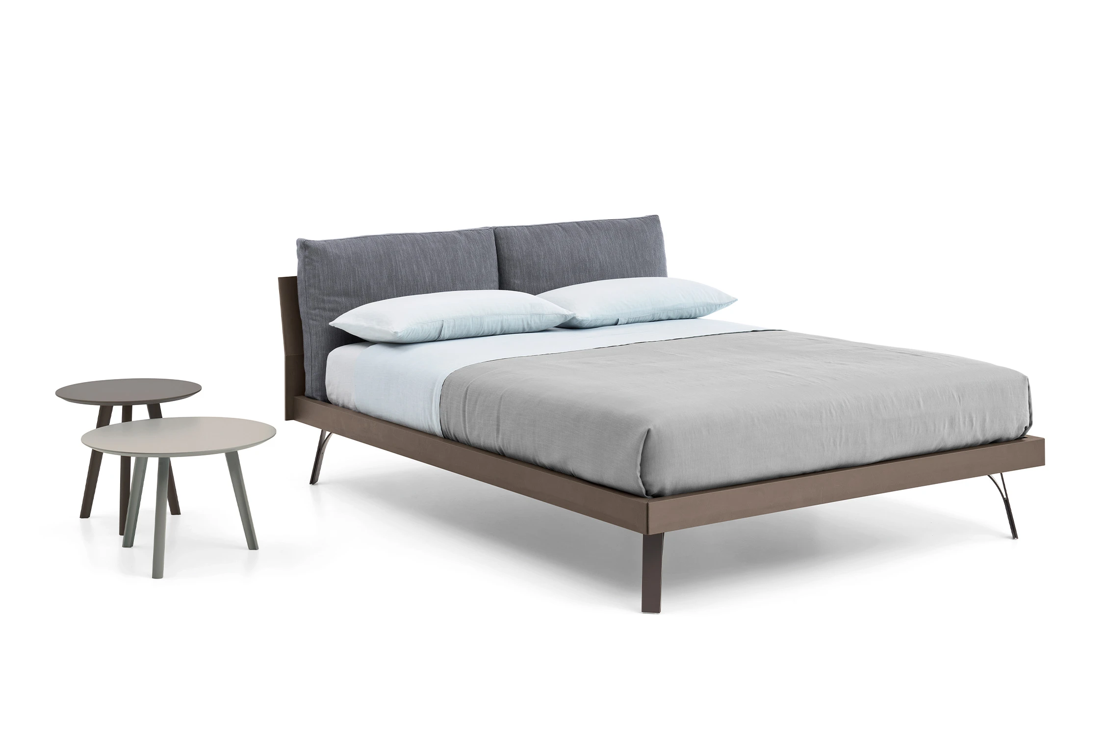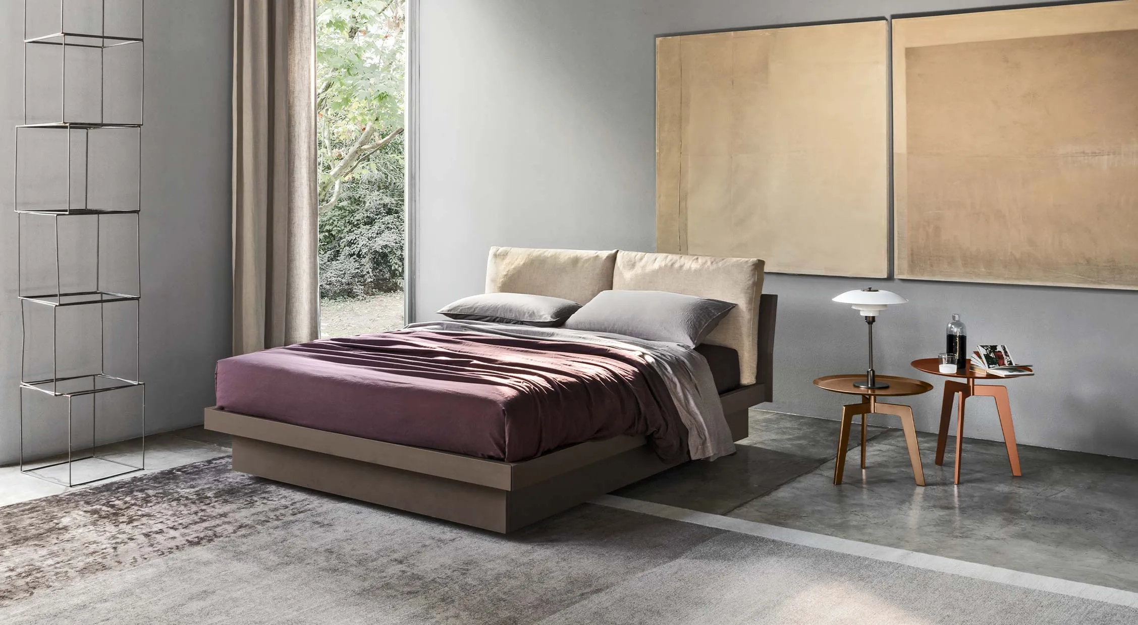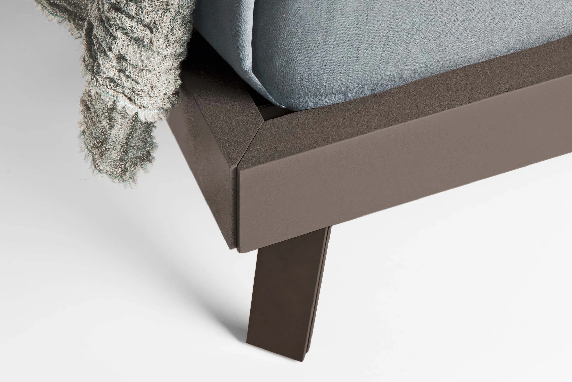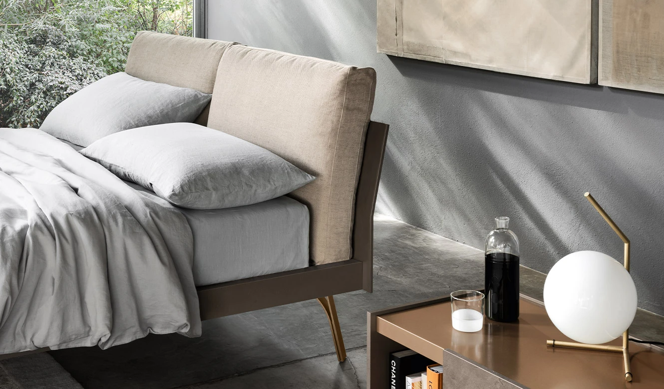 Abbraccio Grafic is a bed that presents linear aesthetics yet highly refined in detail, with a bed frame suitable for lacquered finishes or technical materials. The solid and harmonious structure welcomes soft cushions with polyurethane padding. It can be equipped with a storage unit in Loto Terra material and cushions with removable fabric cover. The storage volume projects beyond the bed perimeter: this creates an effect of suspension and lightness, while maintaining a solid support base.