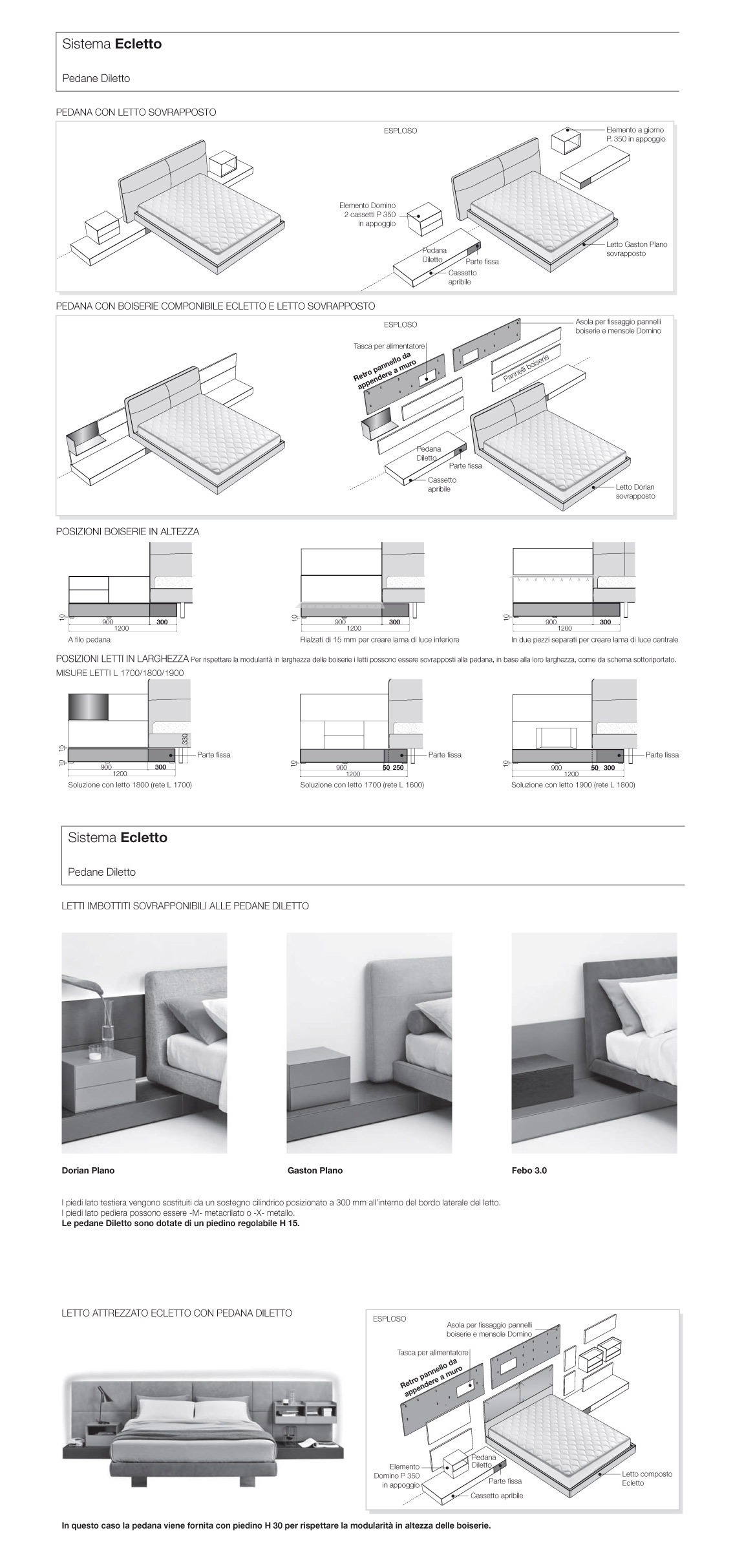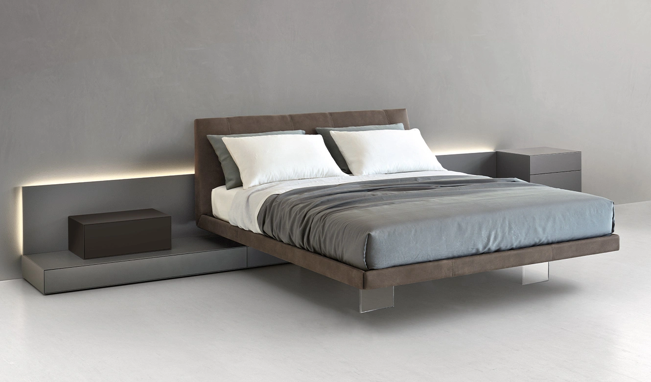 Febo 3.0, Dorian, and Gaston Plano are the beds designed to be paired with the platform; their headboard-side feet are set back on a metal support, allowing for an insertion of up to 300 mm beneath the bed. Furthermore, the bed frame heights (90 and 150 mm) facilitate a seamless composition of the various elements.