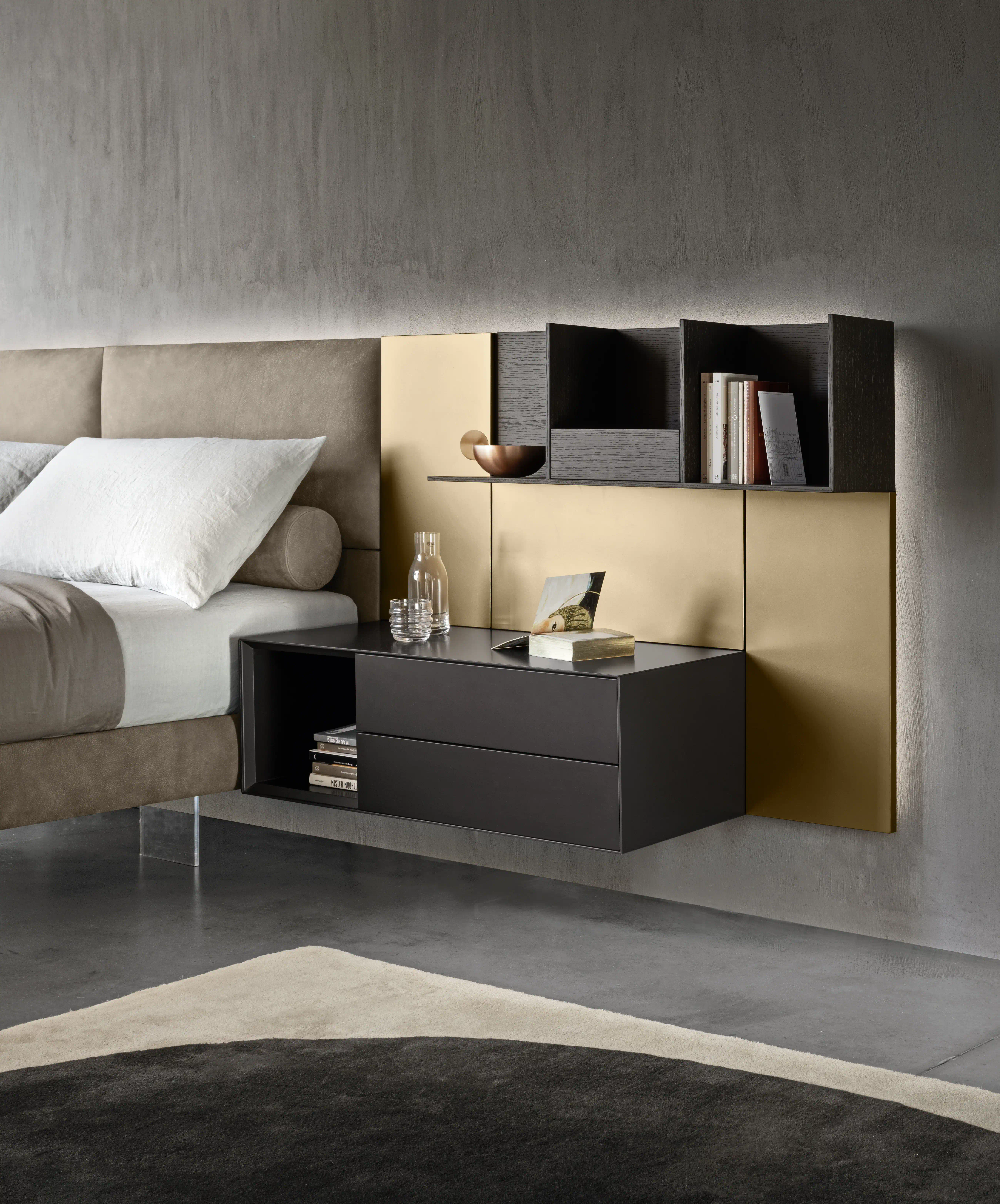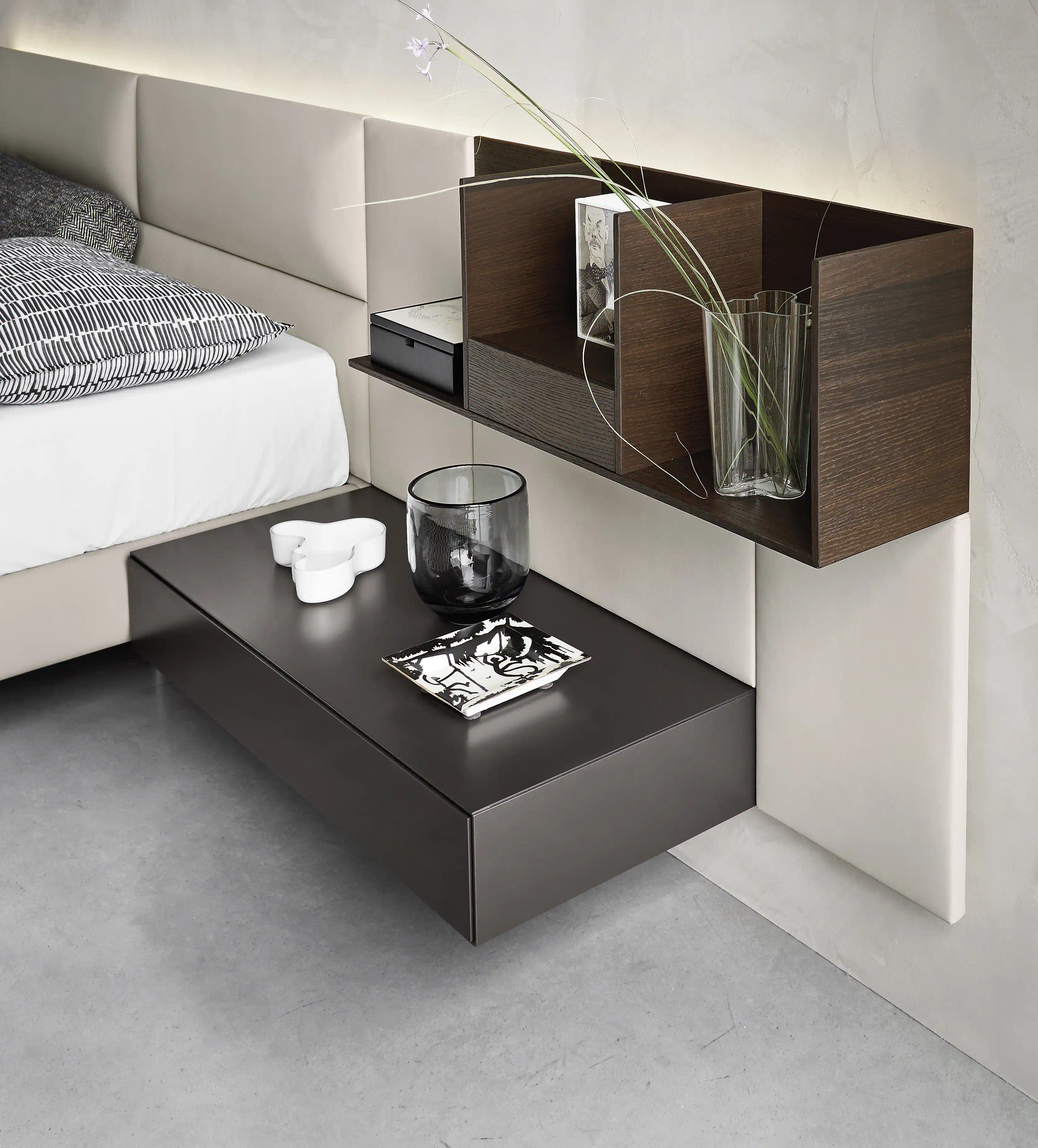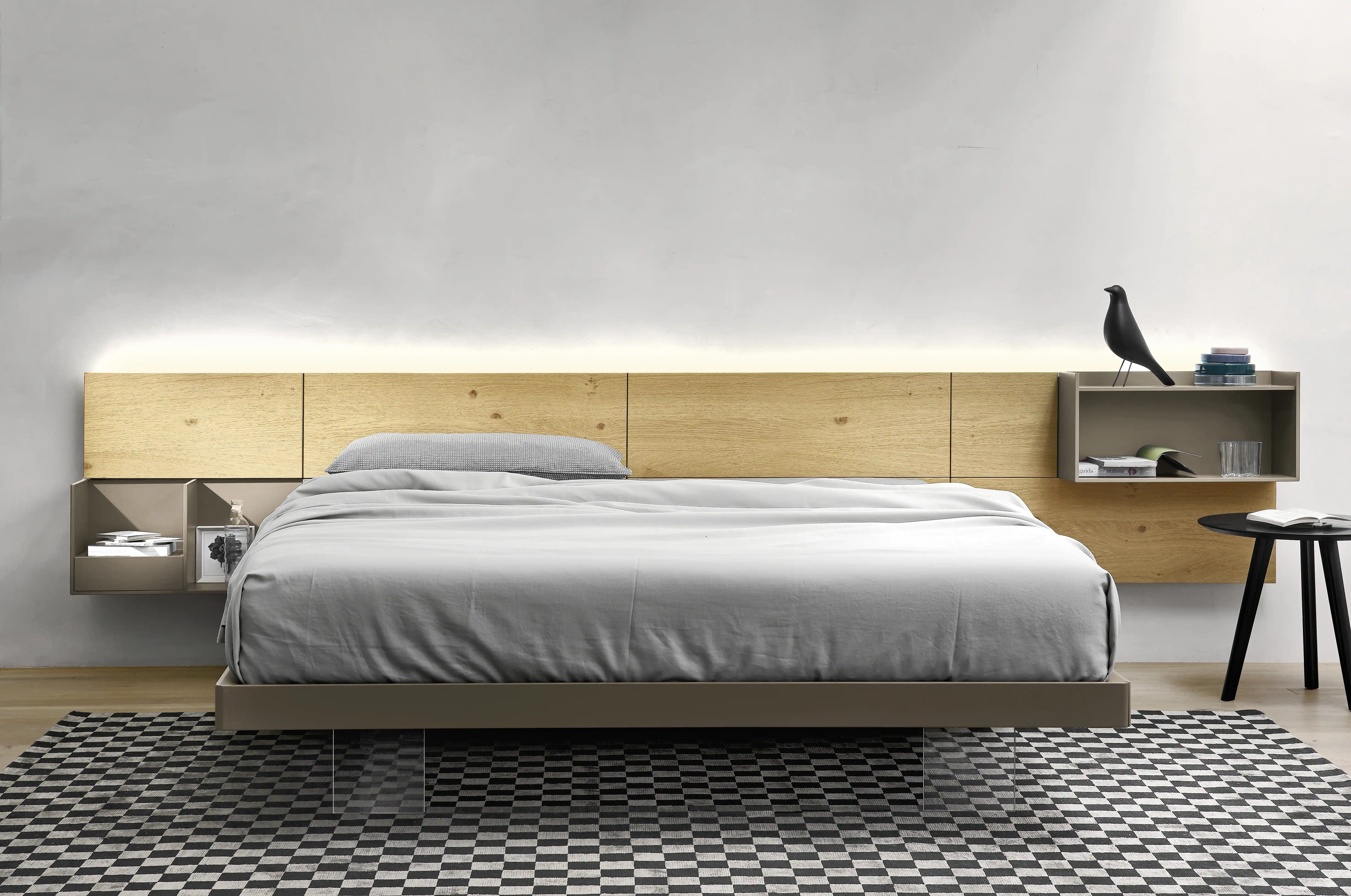 For an interior that blends natural charm with modernity, the Ecletto equipped headboard features veneered boiserie panels in precious natural Knotted Oak, complemented by upper LED lighting that enhances the wood grain and creates a sophisticated atmosphere. This is paired with a sophisticated matte Visone lacquered bed frame, characterized by slim 90 mm side rails and supported by elegant transparent methacrylate feet for a suspended visual effect. The composition is completed by the versatile open Domino shelf, equipped with a drawer and a practical tray (depth 245 mm), also finished in the refined matte Visone lacquer, ensuring aesthetic continuity and functionality beside the bed.