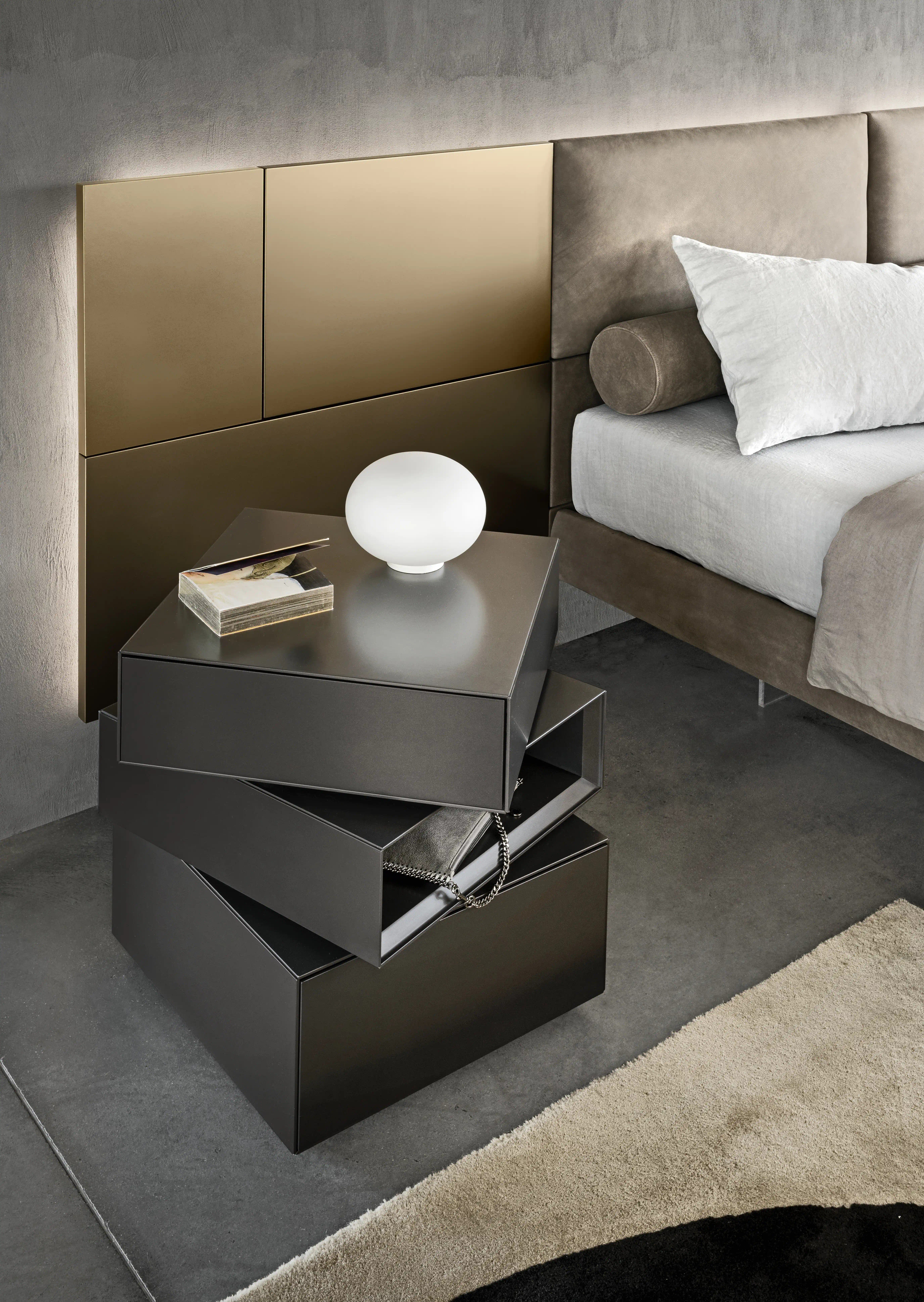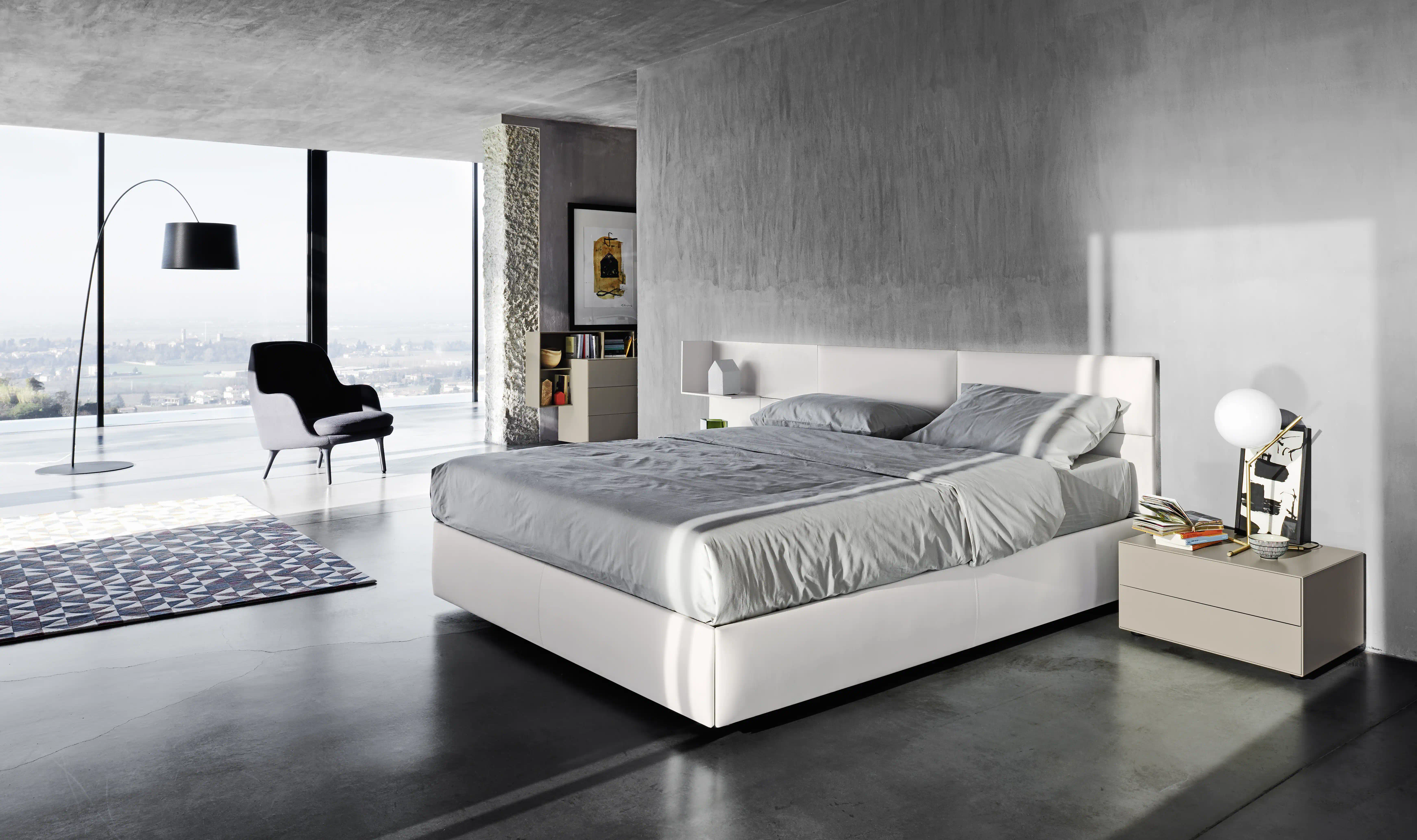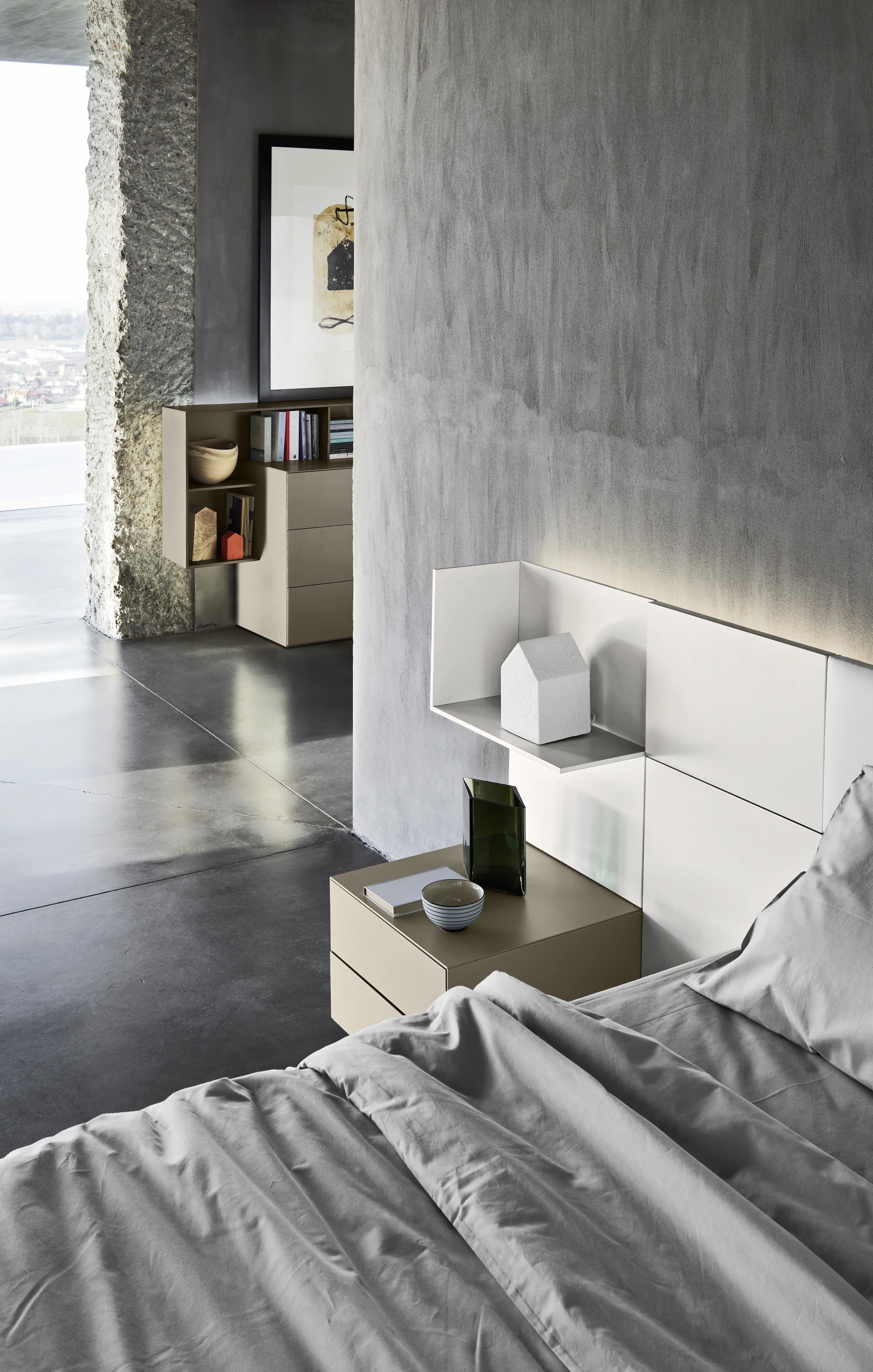 A versatile bed system characterized by a headboard composed of upholstered or wooden boiserie panels that extends laterally, also available in combination with Domino storage units and shelving.