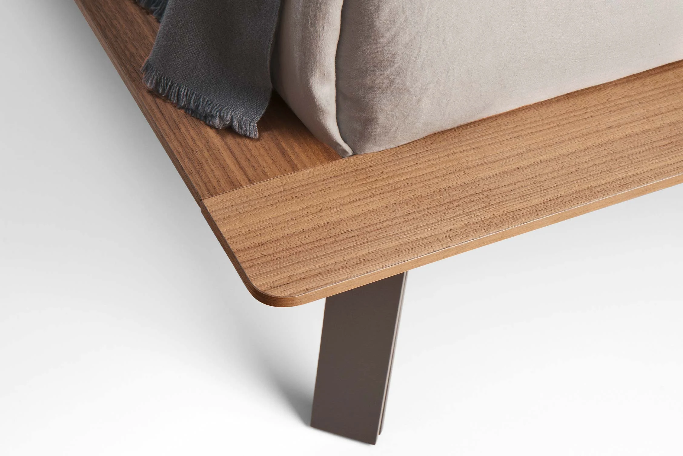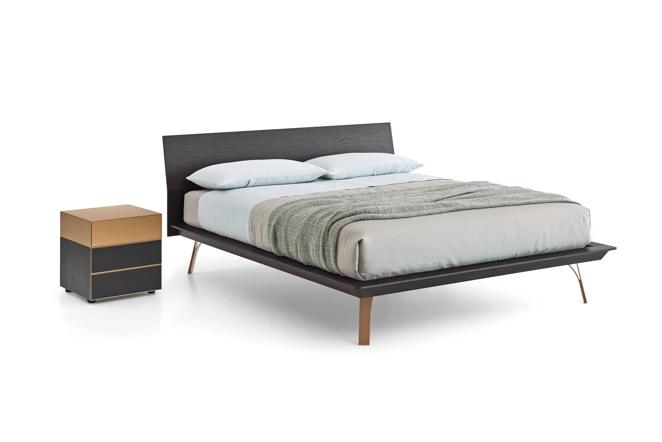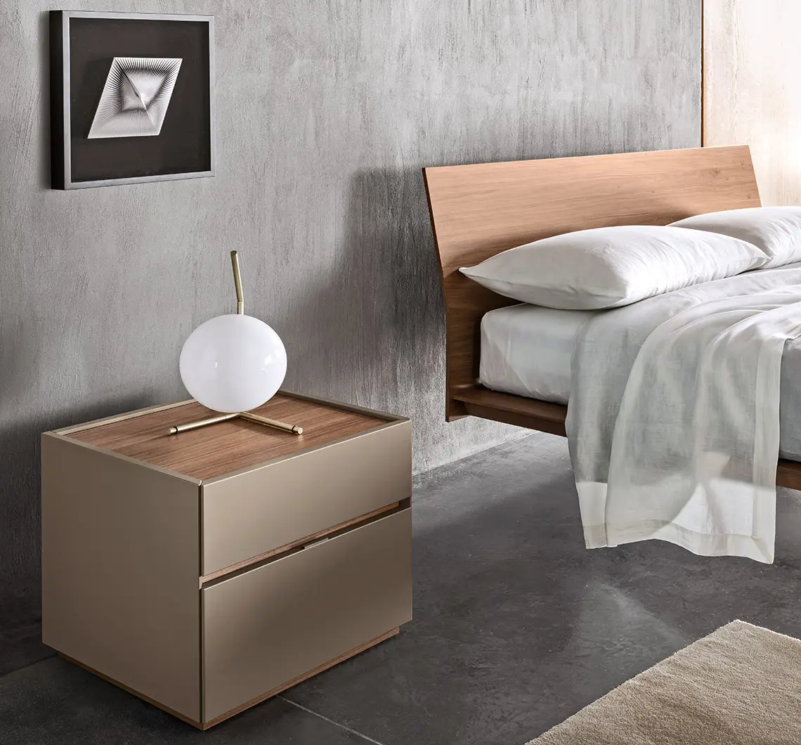 The warmth and natural elegance of wood blend in perfect harmony with rigorous, clean lines, creating a minimalist yet highly functional structure. The headboard and bed frame feature generous thicknesses, which are visually slimmed down through meticulous "scanso" (recessed) machining. The bed frame appears to float, supported by either robust turned solid wood feet or slender, coupled metal sheets that curve and diverge—combining great functional solidity with an extraordinary visual lightness.