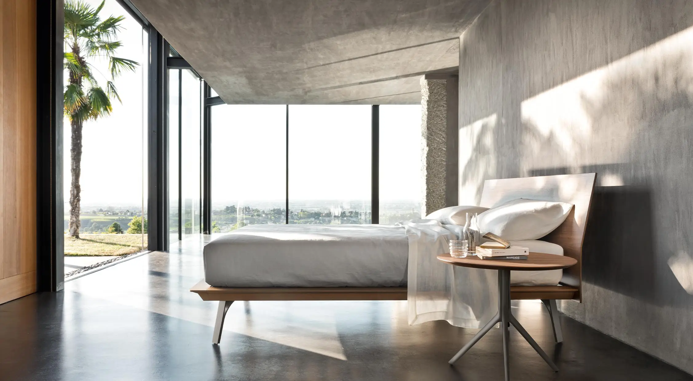 The clean lines of the Folio bed harmoniously combine with essential furnishing accessories where practicality merges with elegance and style. Among the components suitable to accompany Folio, the Iris coffee table or the Tape mirror stand out, for a minimalist style with clean lines.