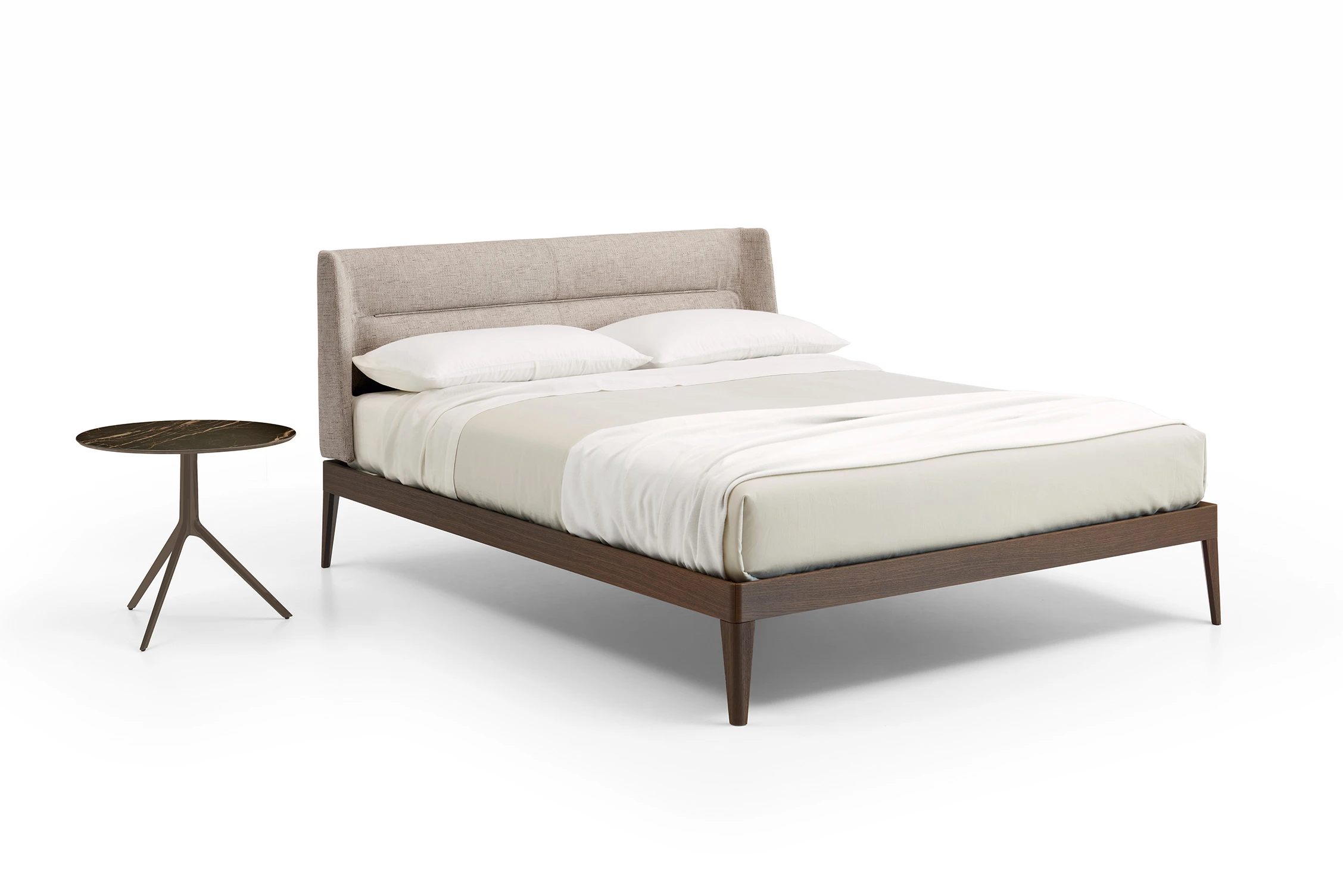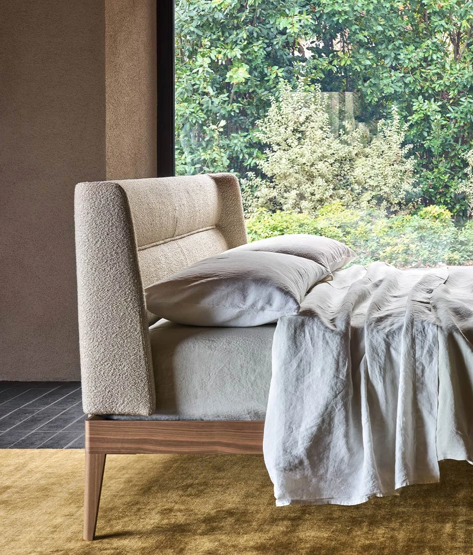 The enveloping headboard of the Nest bed features an integrated padded topper designed to promote an ergonomic posture, perfect for reading or watching TV in total comfort. The richness of the construction details defines this piece, offering a bed frame available in solid wood or matte lacquer. The frame features a 90 mm high side rail and rests on either matching wood feet or laser-cut shaped metal legs, providing a sleek and contemporary finish.