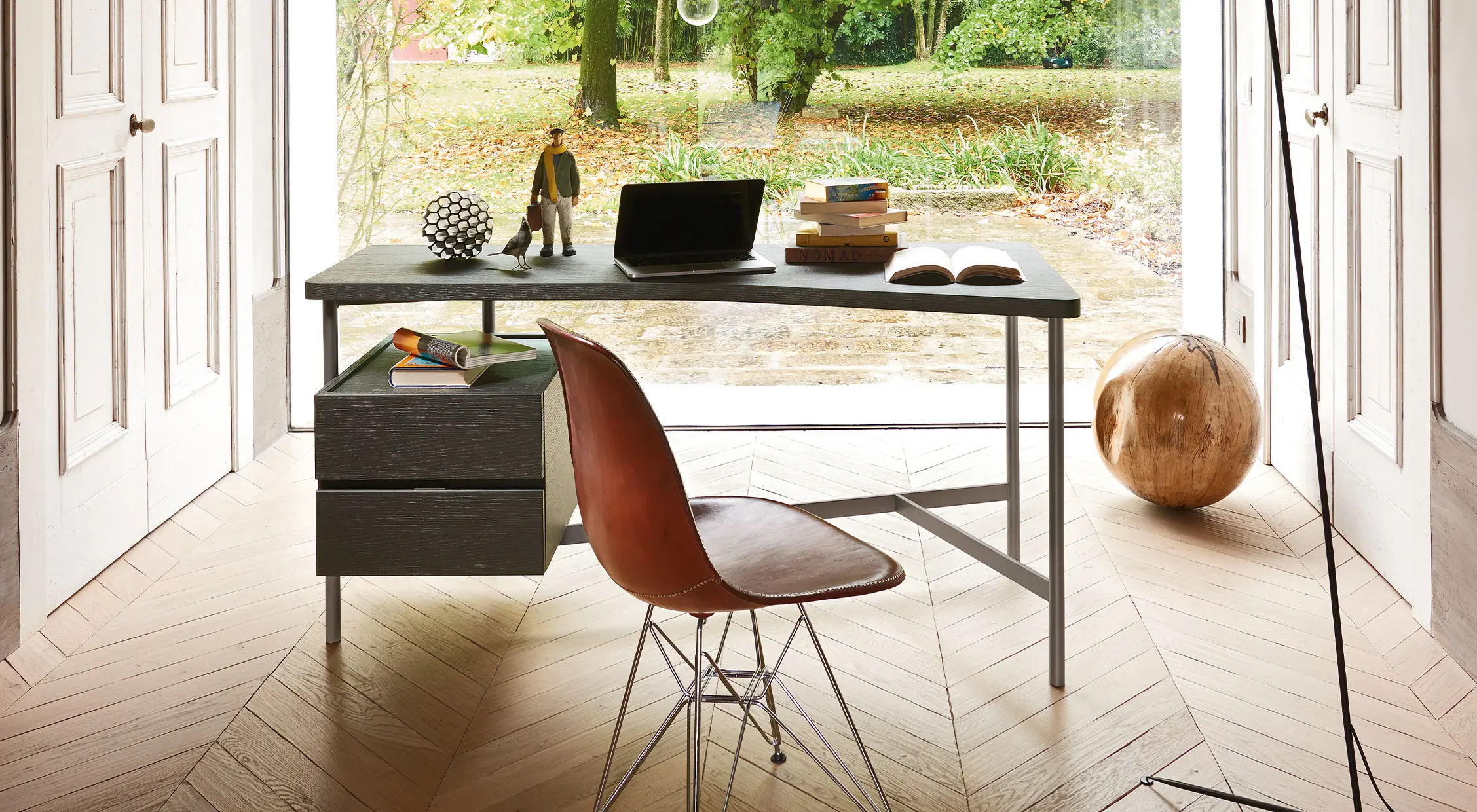 For those wishing to create a small home studio, a home office, or simply enrich the living area, the Desk writing desk is an ideal solution, characterized by rounded forms and a pleasing mix of wood and metal: it features a metal structure with rounded uprights and a shaped wood top finished on all sides.