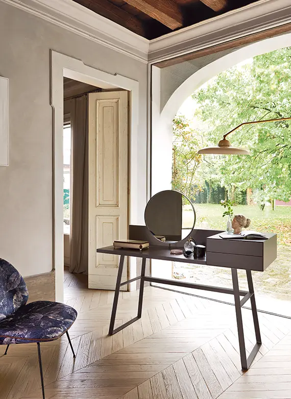 Segreto can transform into a beautiful vanity table or a practical writing desk in the mirrorless version, designed to organize a home office or a dedicated space for reading, note-taking, and relaxation, embodying a refined furnishing culture.
