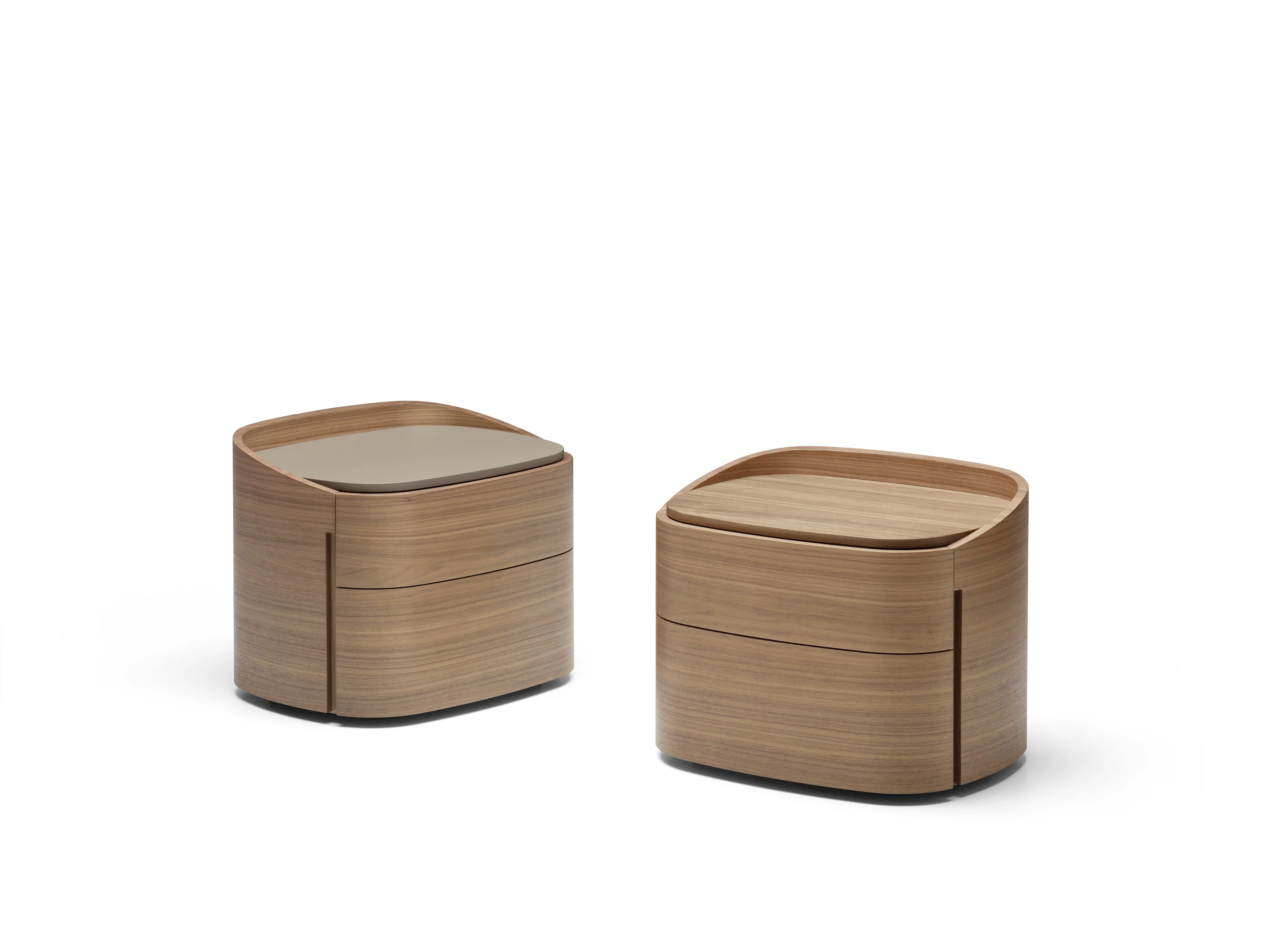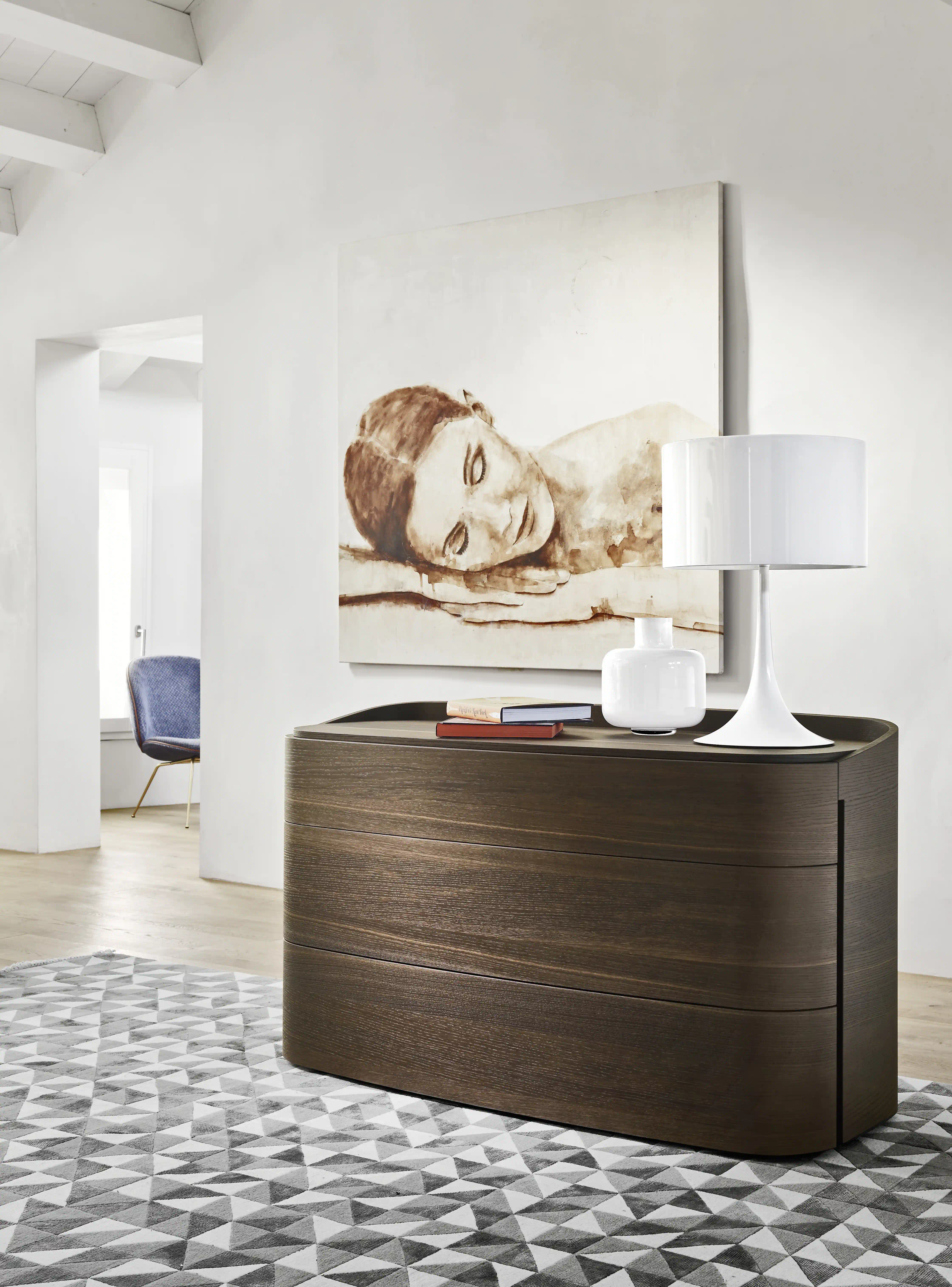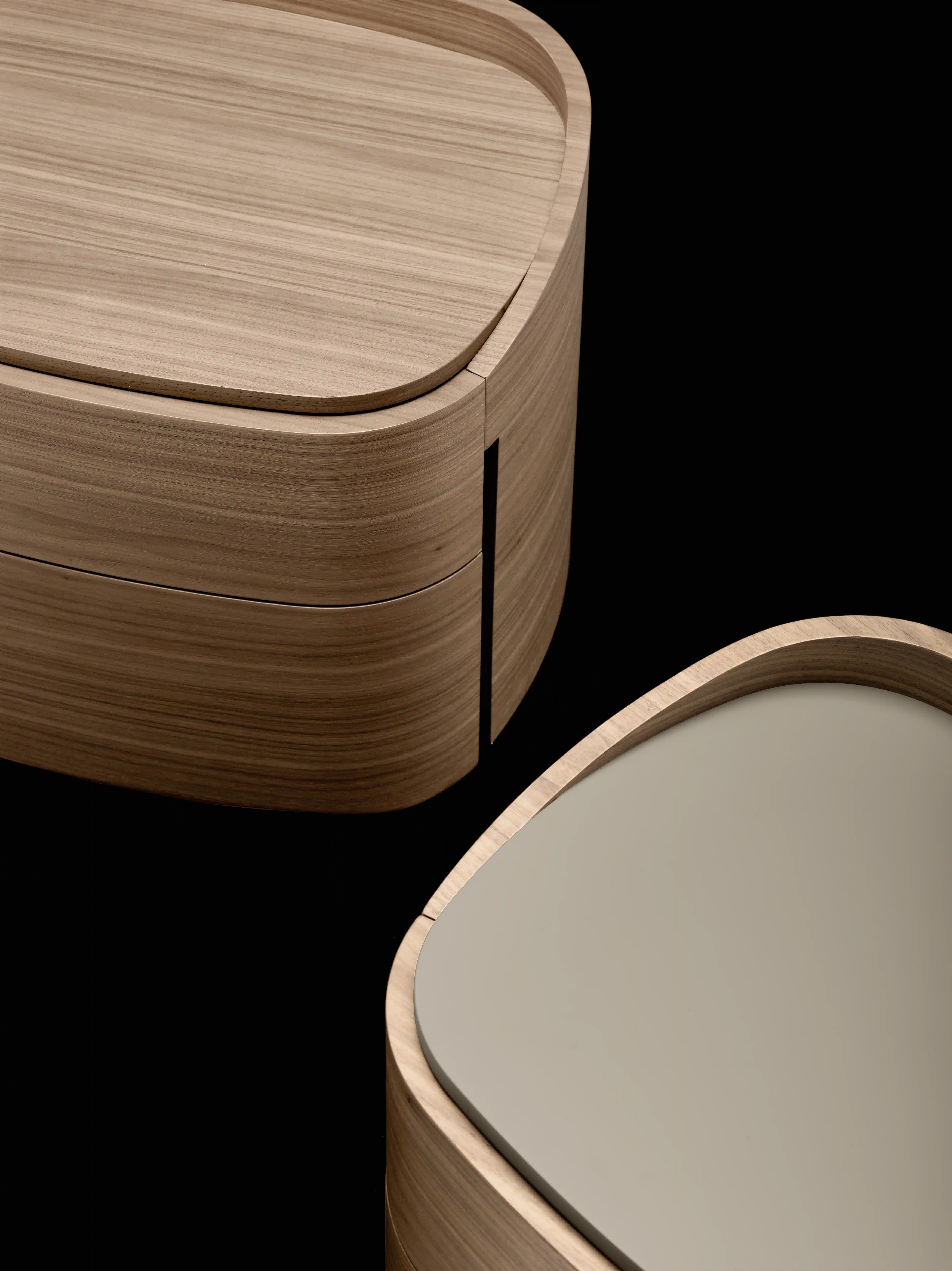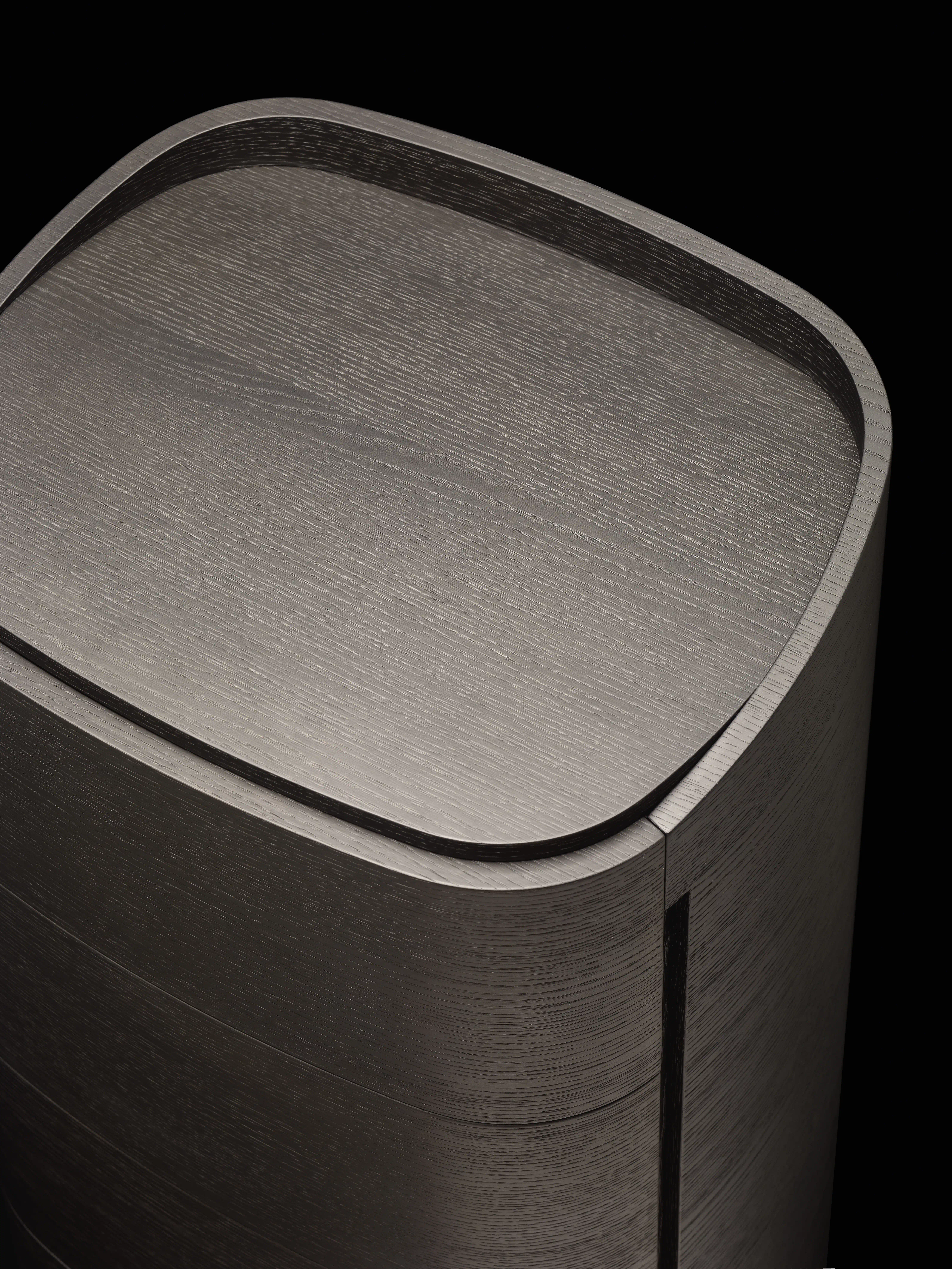 The Babila containers are distinguished by their rounded shapes and the upper profile that rises above the top, which in turn highlights its thickness, projecting beyond the edge of the upper drawer. The vertical cut for opening the drawers is the distinctive mark of this project. The wood veneer completely wraps the furniture, embracing it seamlessly.