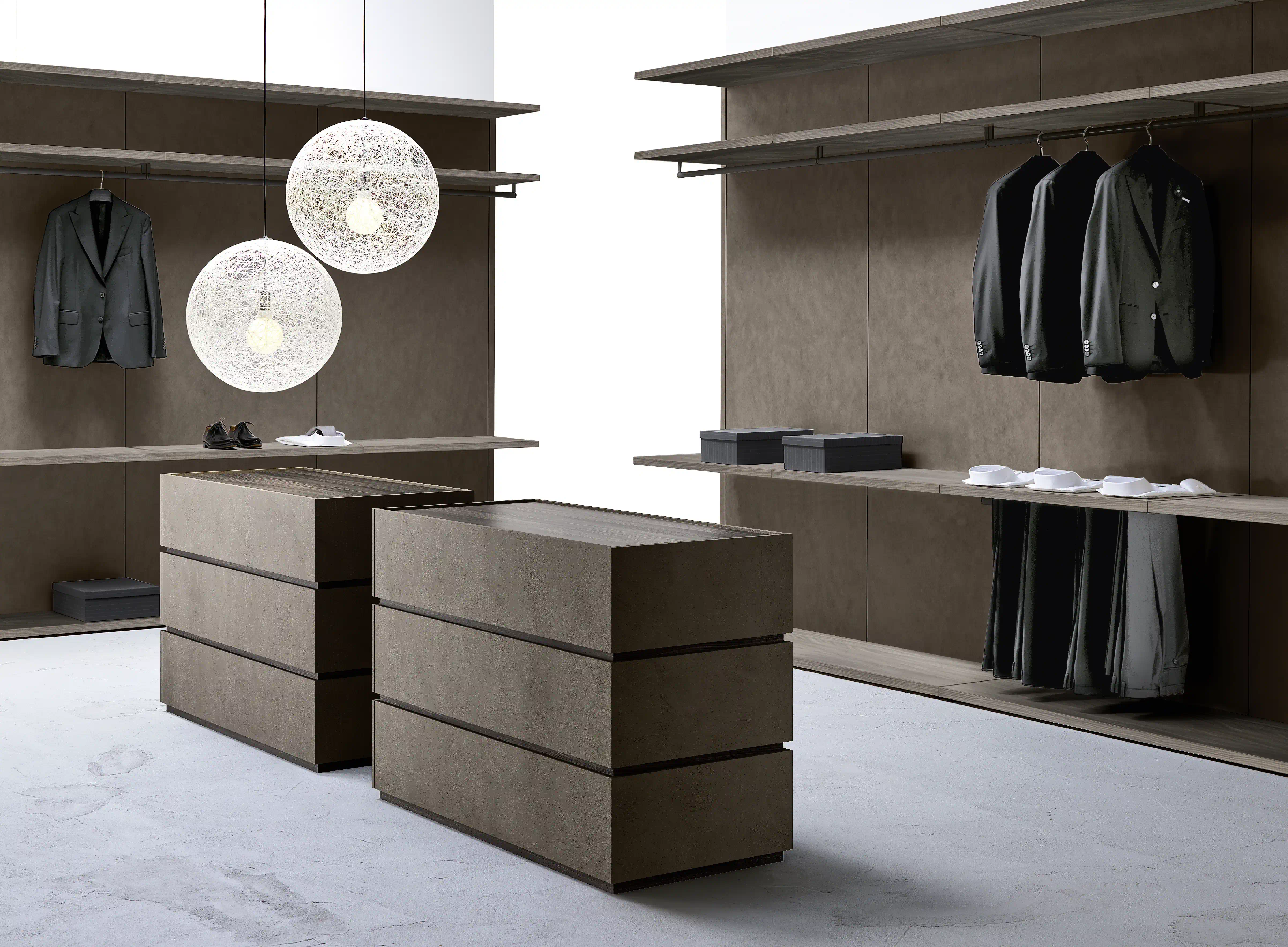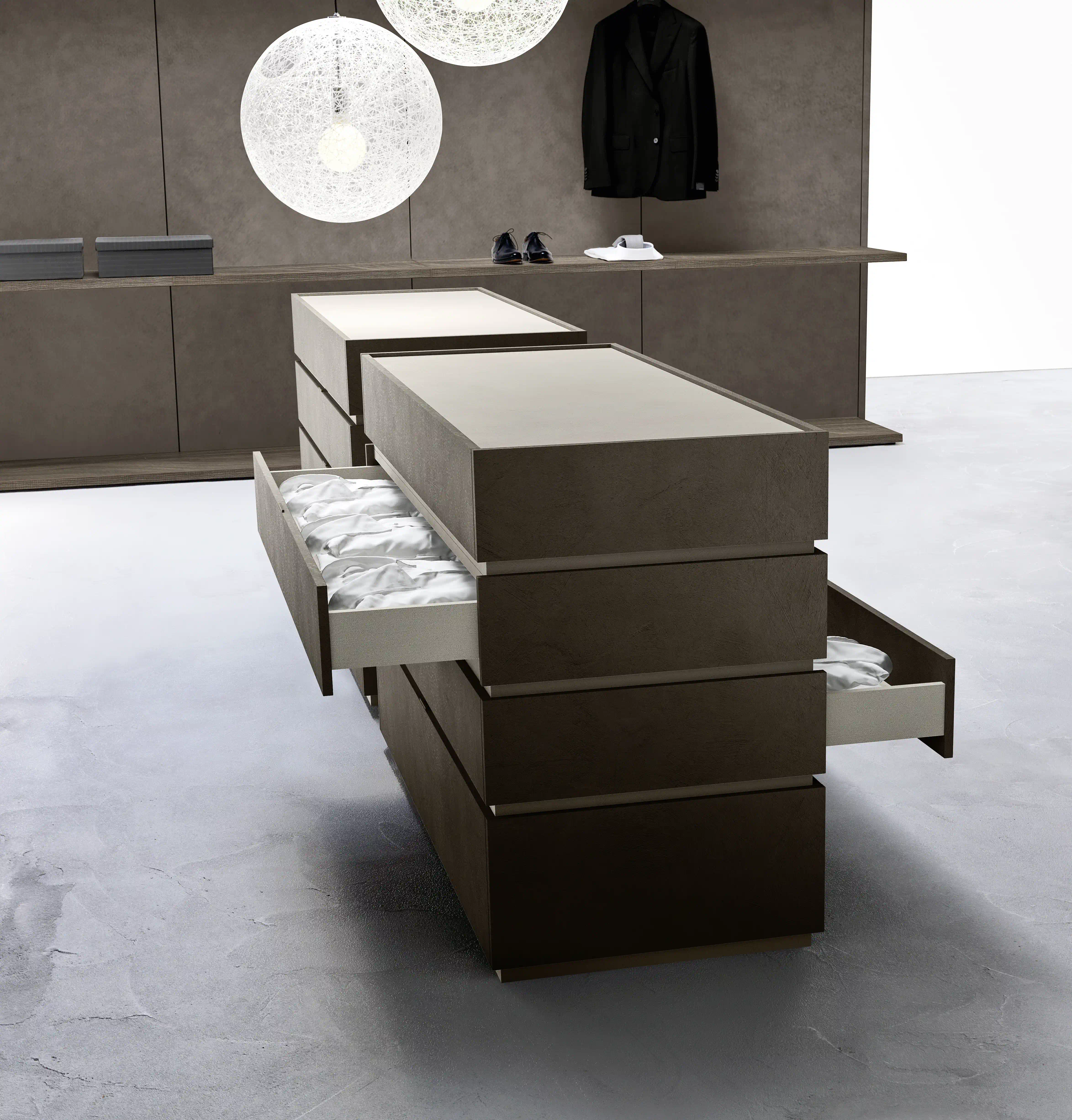 The divisions between the drawers that continue on the sides and the multiple possibilities of realization through finishes and openings on the front and back, allow compositions to be placed in the center of the room, suggesting further opportunities for use: not only to contain objects inside, but also to divide and organize the surrounding space.