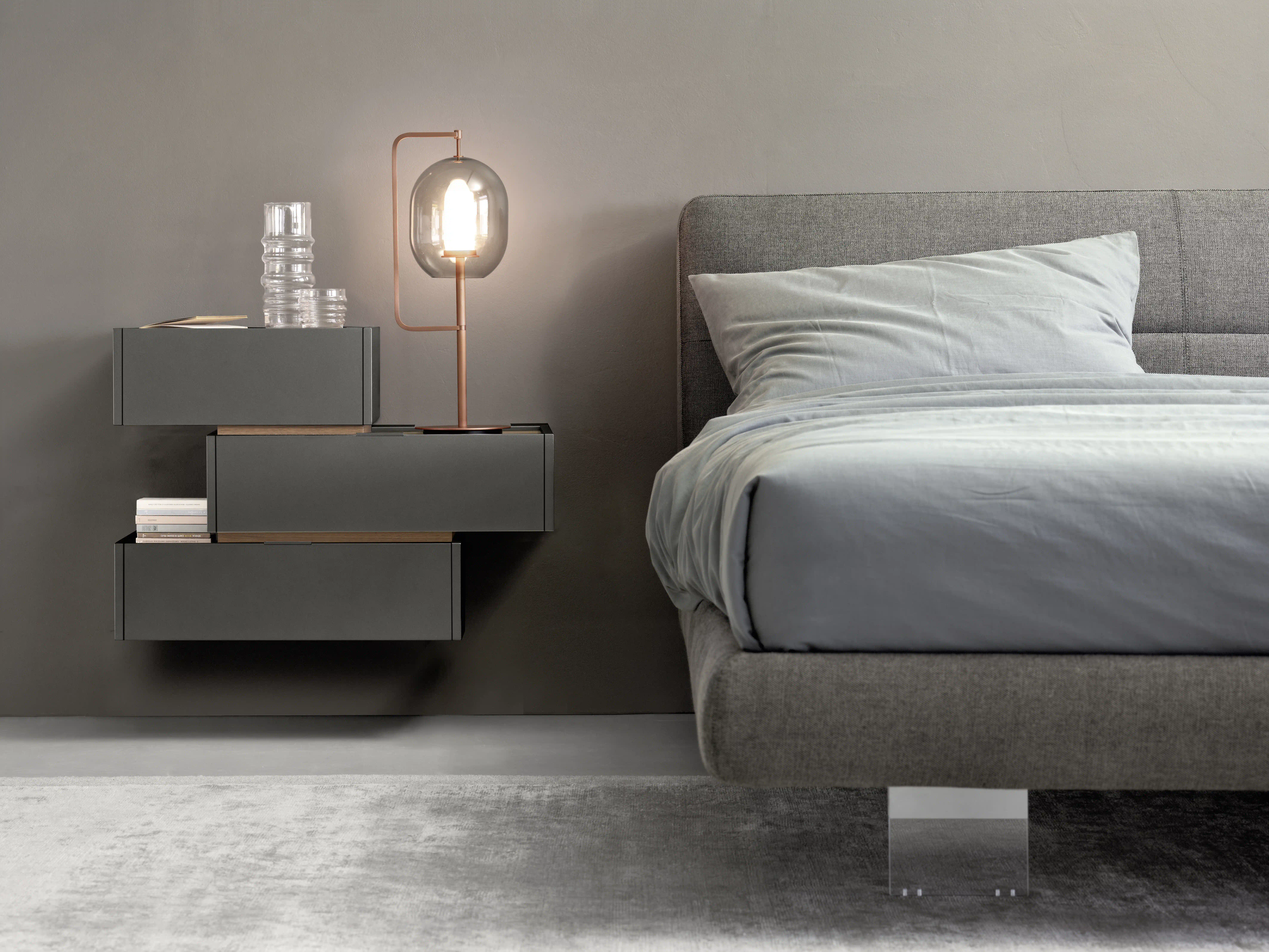 The design of the bedside tables and chests of drawers from the Filo Mono line is expressed through a contemporary and essential language, where the top and sides flush with the drawers are dressed in material and lacquered finishes.