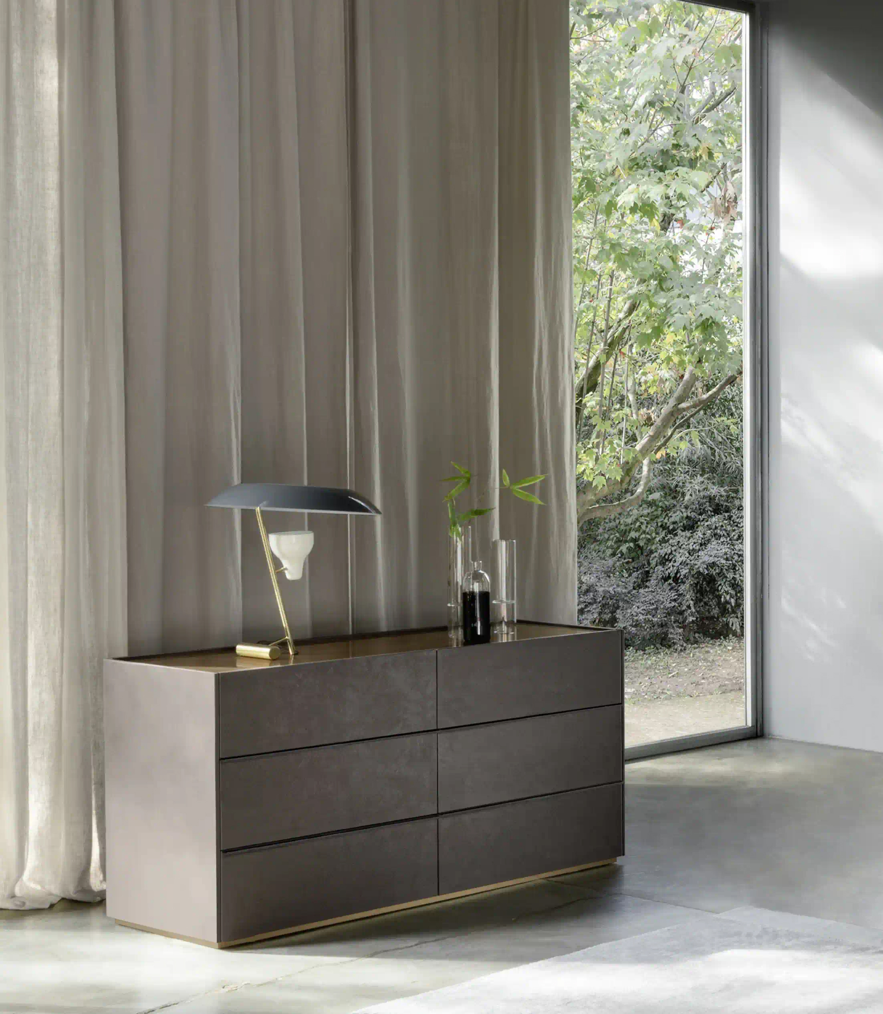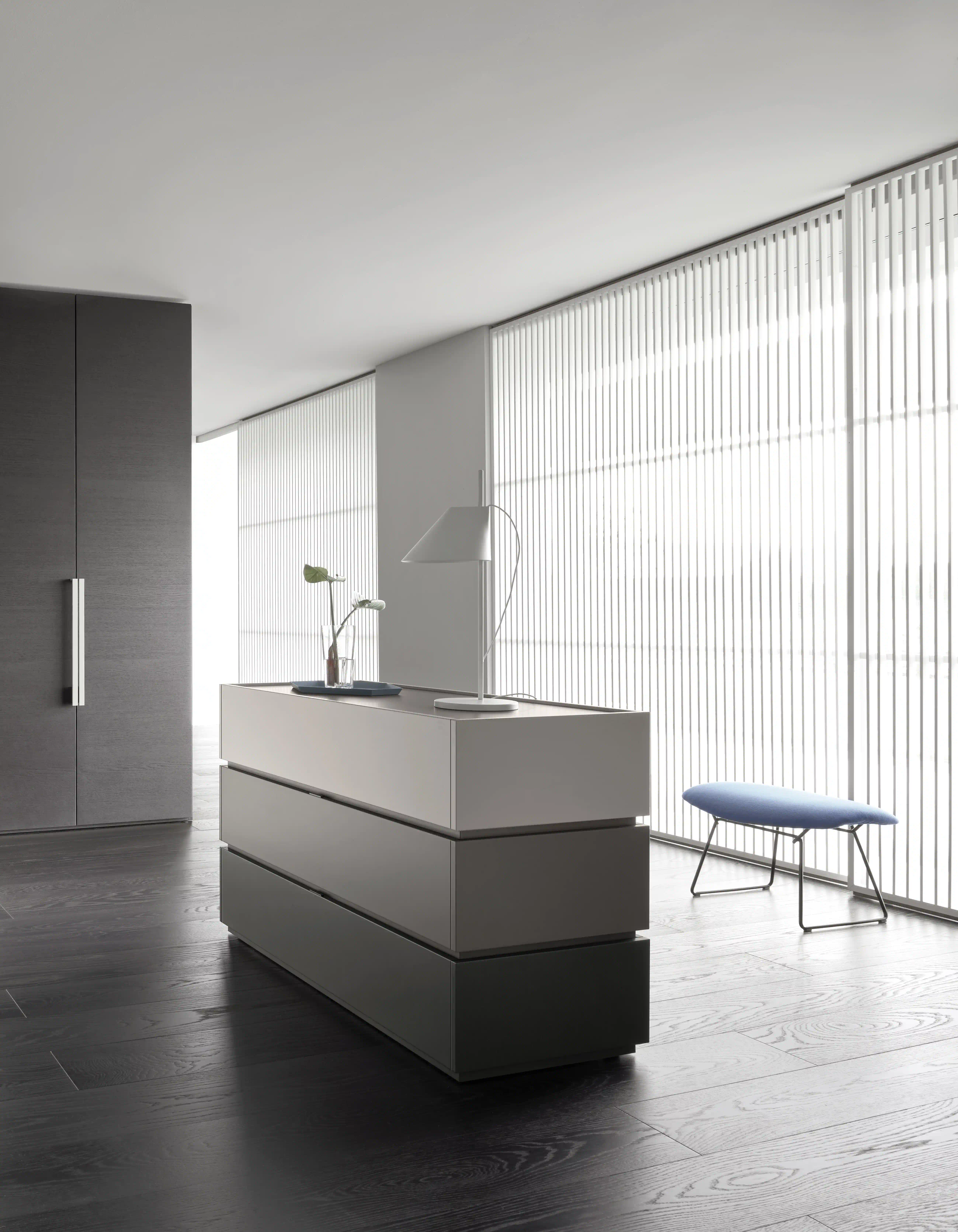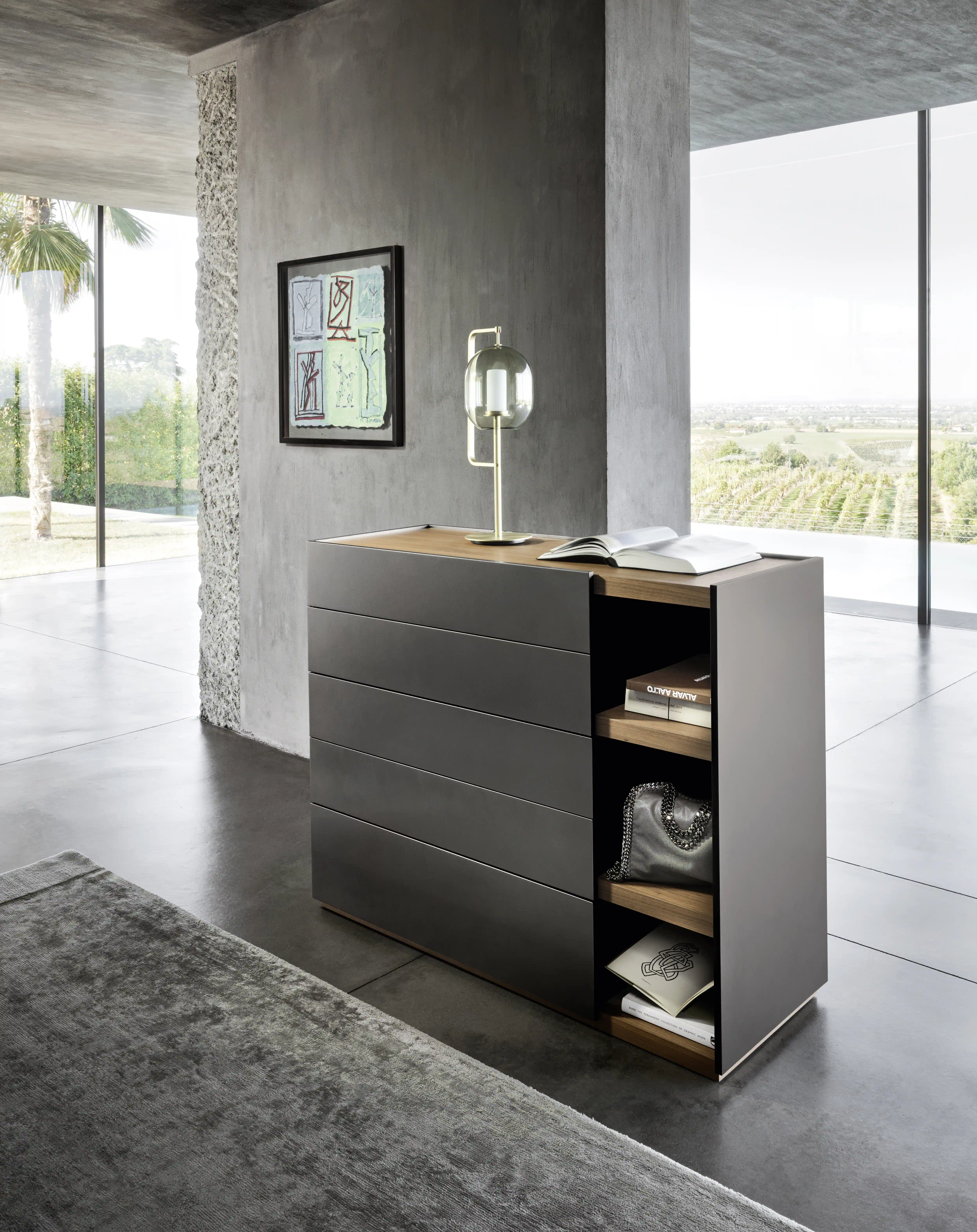 A sequence of solids and voids, characterized by alternating finishes, is the concept that guides the Filo Open line, a family of horizontal or vertical bedside tables and chests of drawers. A design that creates movement within the environment that hosts it.