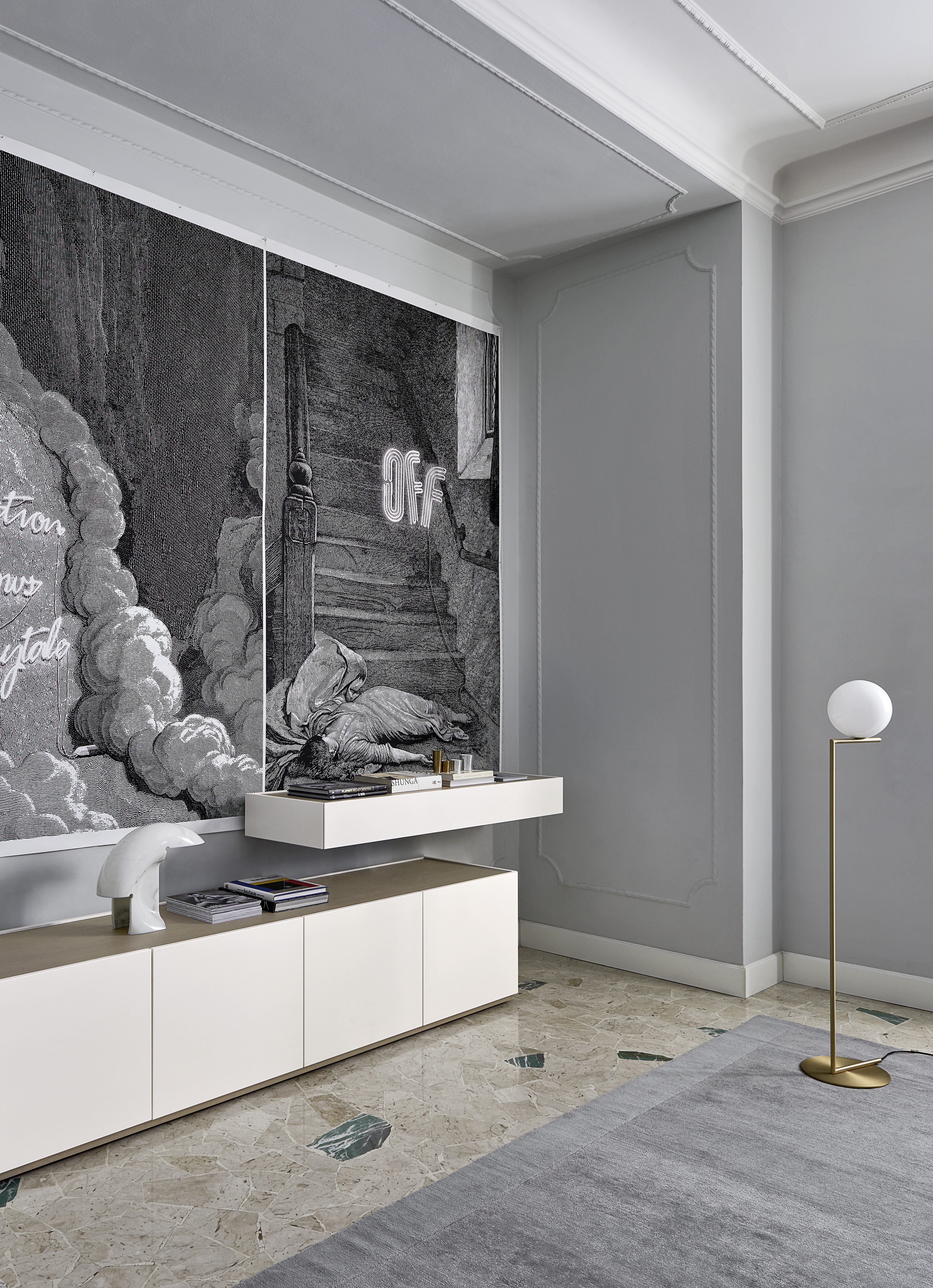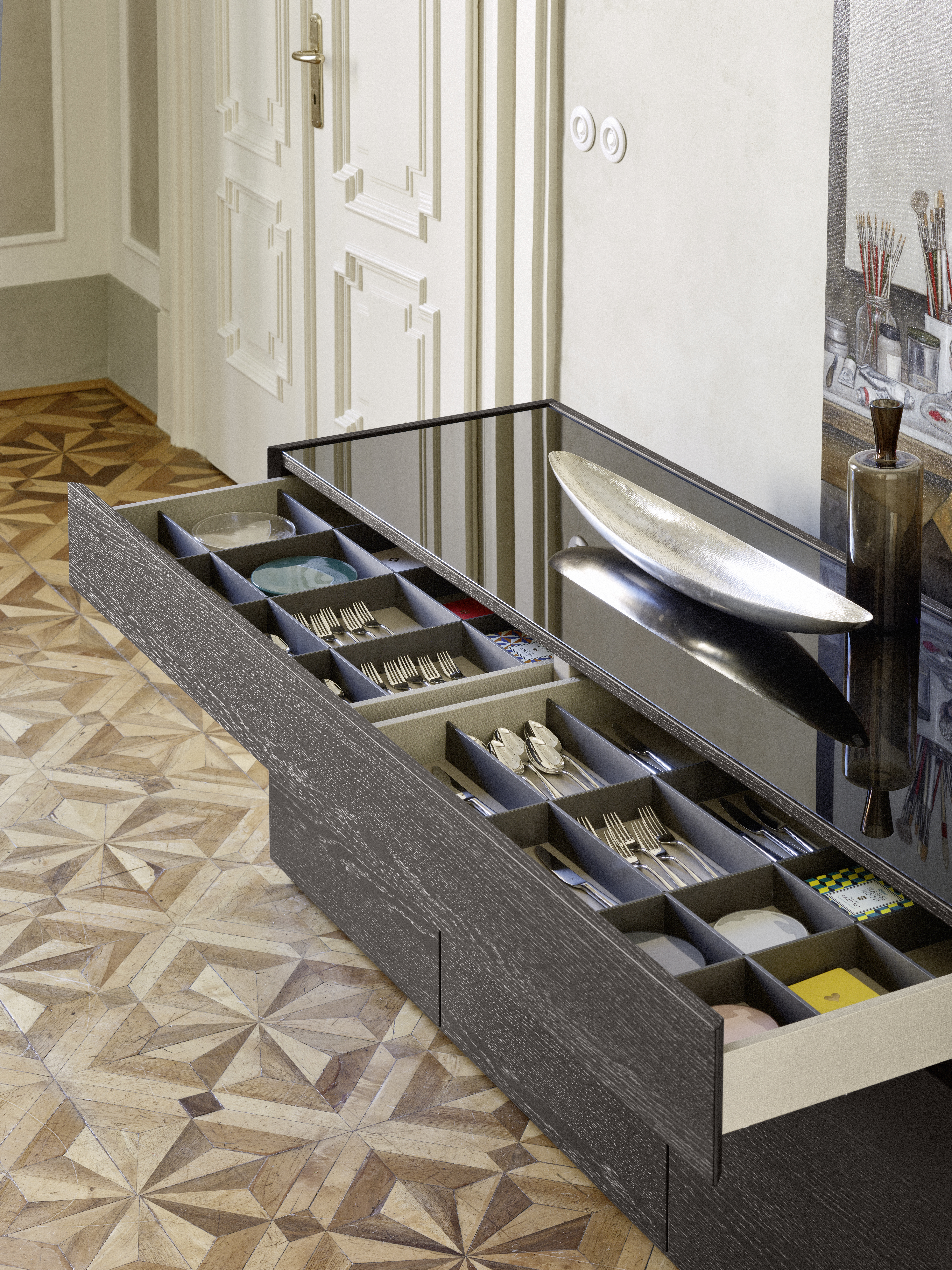 The Cidori elements are distinguished by the 45° joint between the side and the front and by the slightly lowered top that allows for a tray recess. This feature allows you to finish the furniture with a glass top, or alternatively to stack multiple elements flawlessly, achieving different volumes and heights.