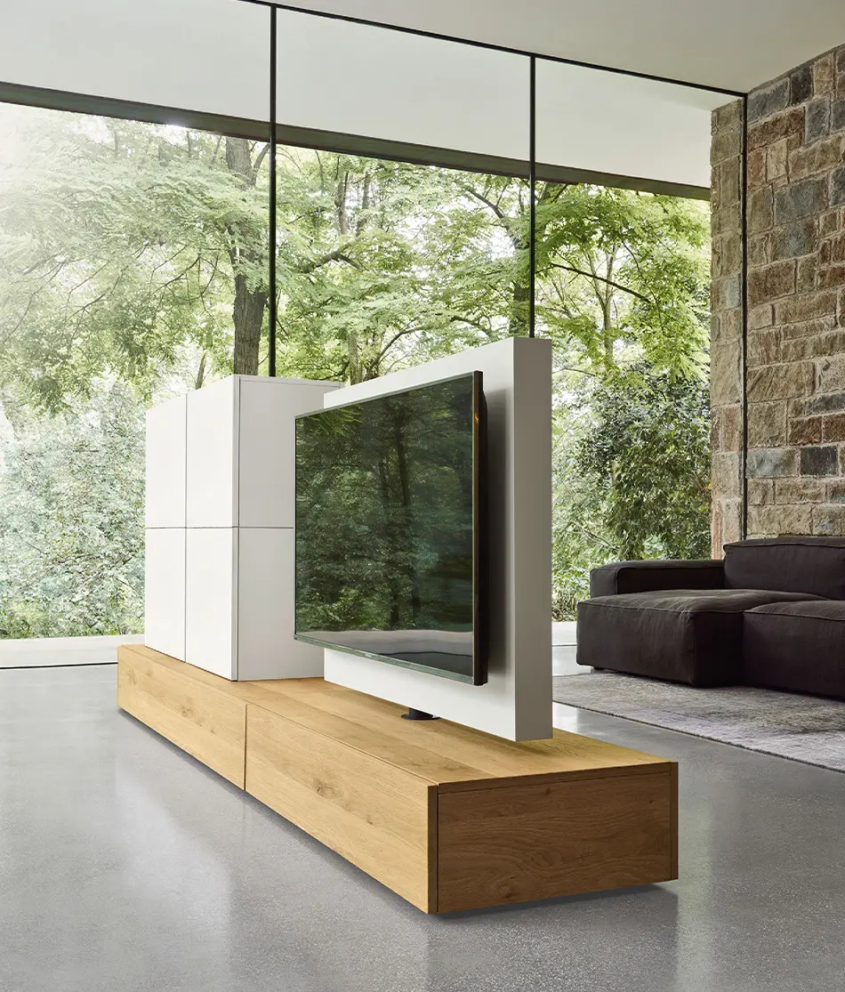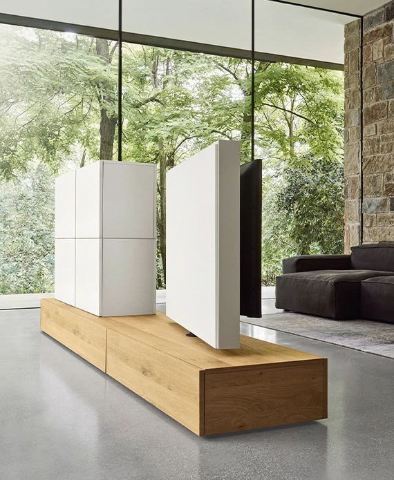 The Roto TV panel is finished on both sides and, thanks to a pivot, can be rotated as desired with a simple gesture, becoming a distinctive and central element in the living area. Order and cleanliness of the spaces are always guaranteed as the TV screen connection cables are neatly enclosed within the base.