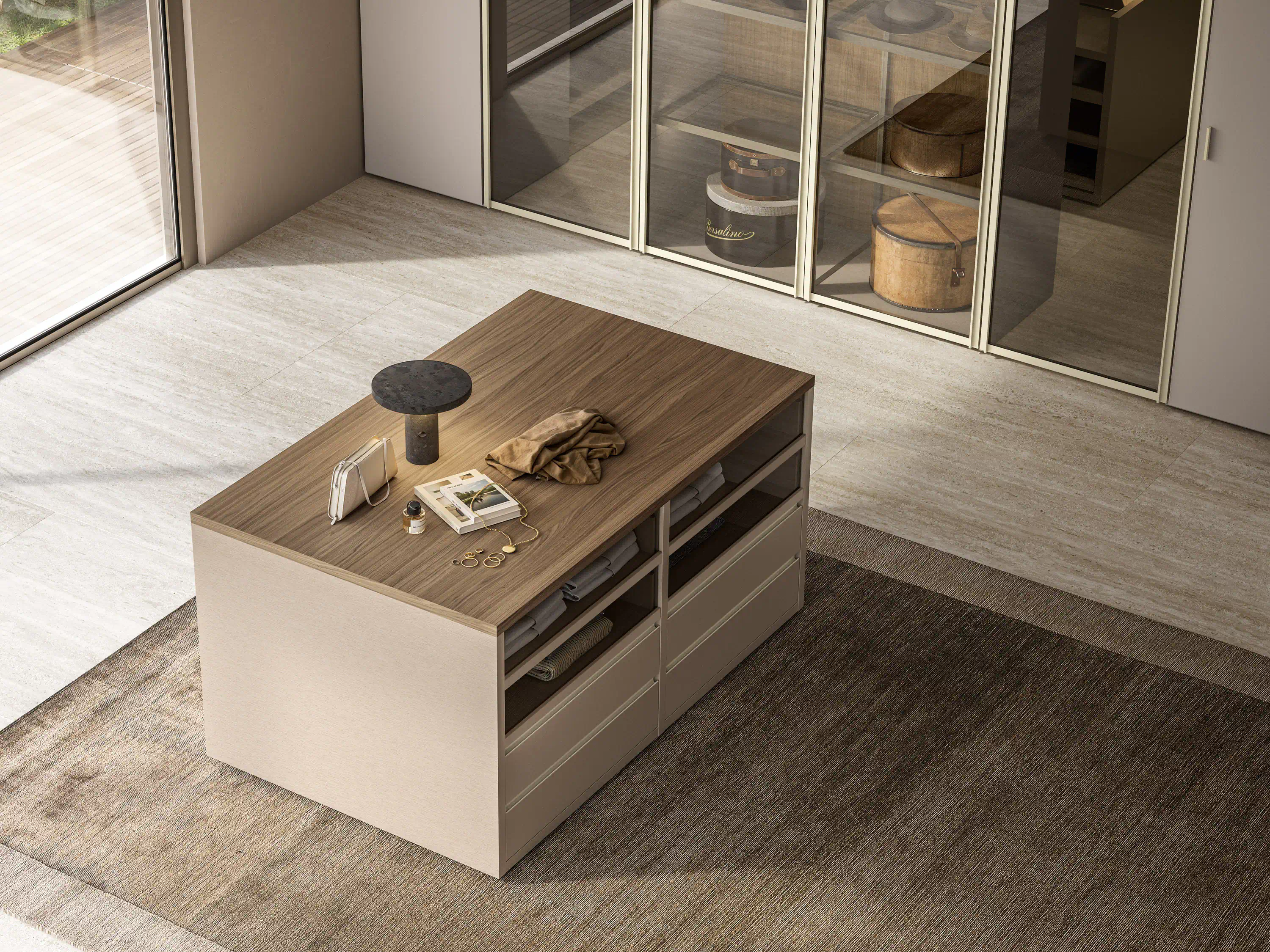 In larger compositions, opposing and side-by-side modules create a grand double-sided island that becomes the centerpiece of the room. In addition to the wood and glass drawers, this configuration offers a generous finishing top (for instance, in Econoce textured finish on a Silice lacquered structure) that serves as a convenient surface for placing clothes and accessories while curated daily looks.