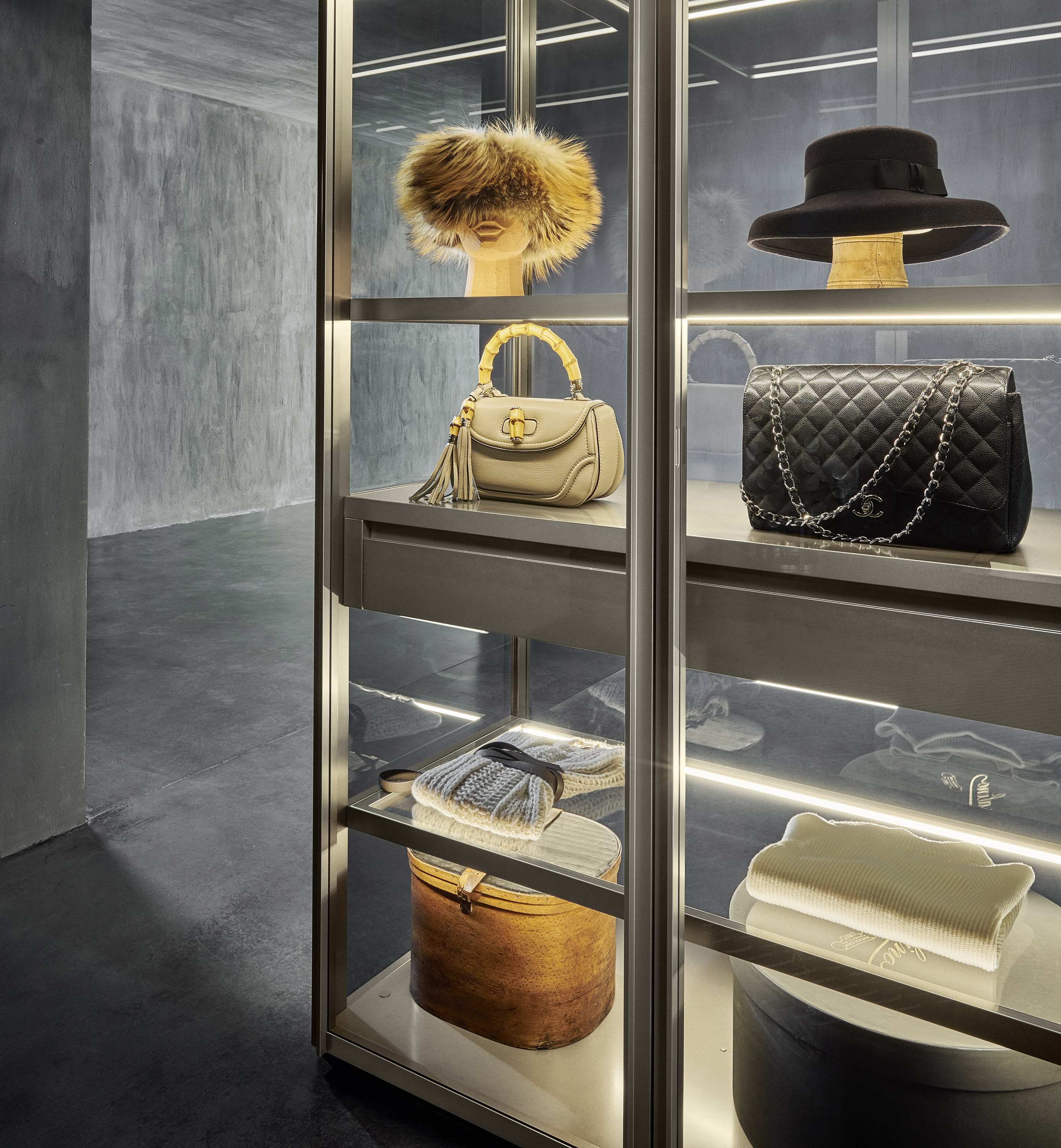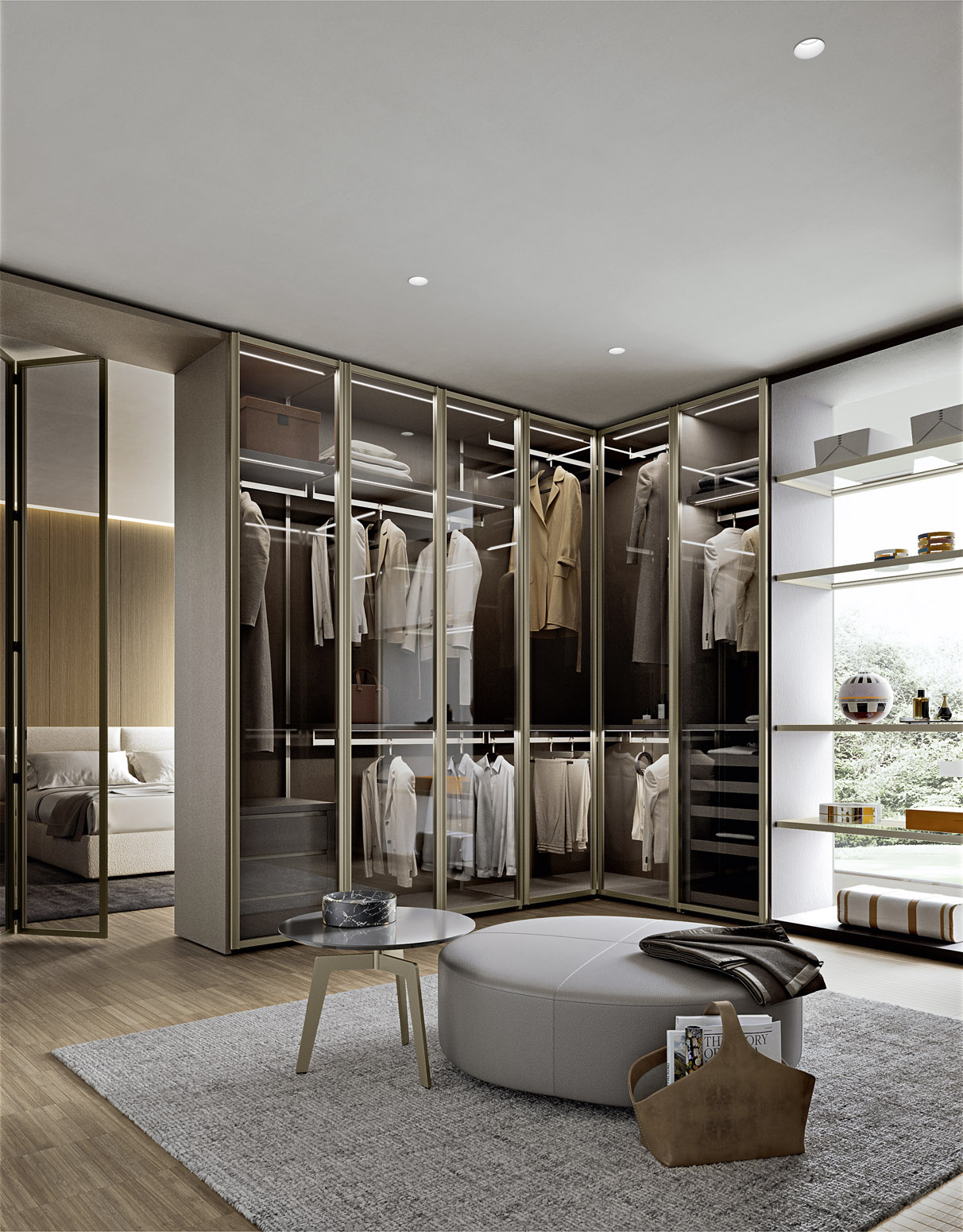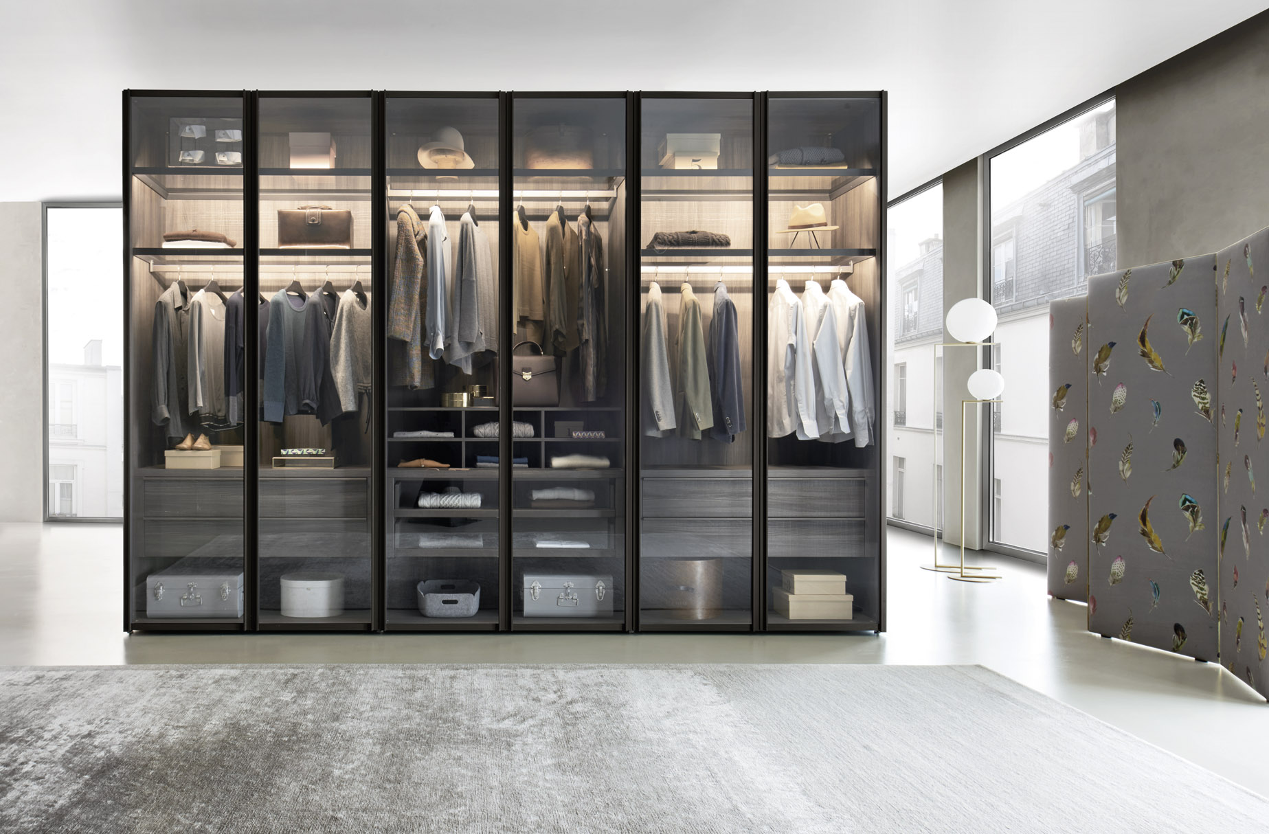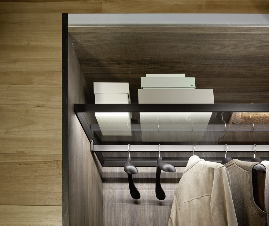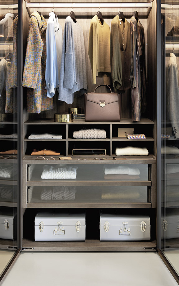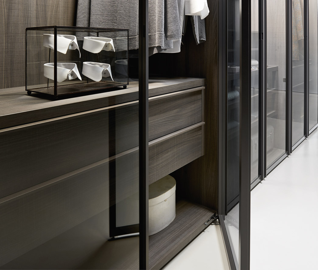 The Scrigno hinged door, in smoked transparent glass with a Brown metal frame, transforms the wardrobe into a fascinating display, further enhanced by the internal lighting system. Sweater racks, drawer units, and pull-out trays in a dark Elm finish with glass fronts highlight your most precious objects and accessories.