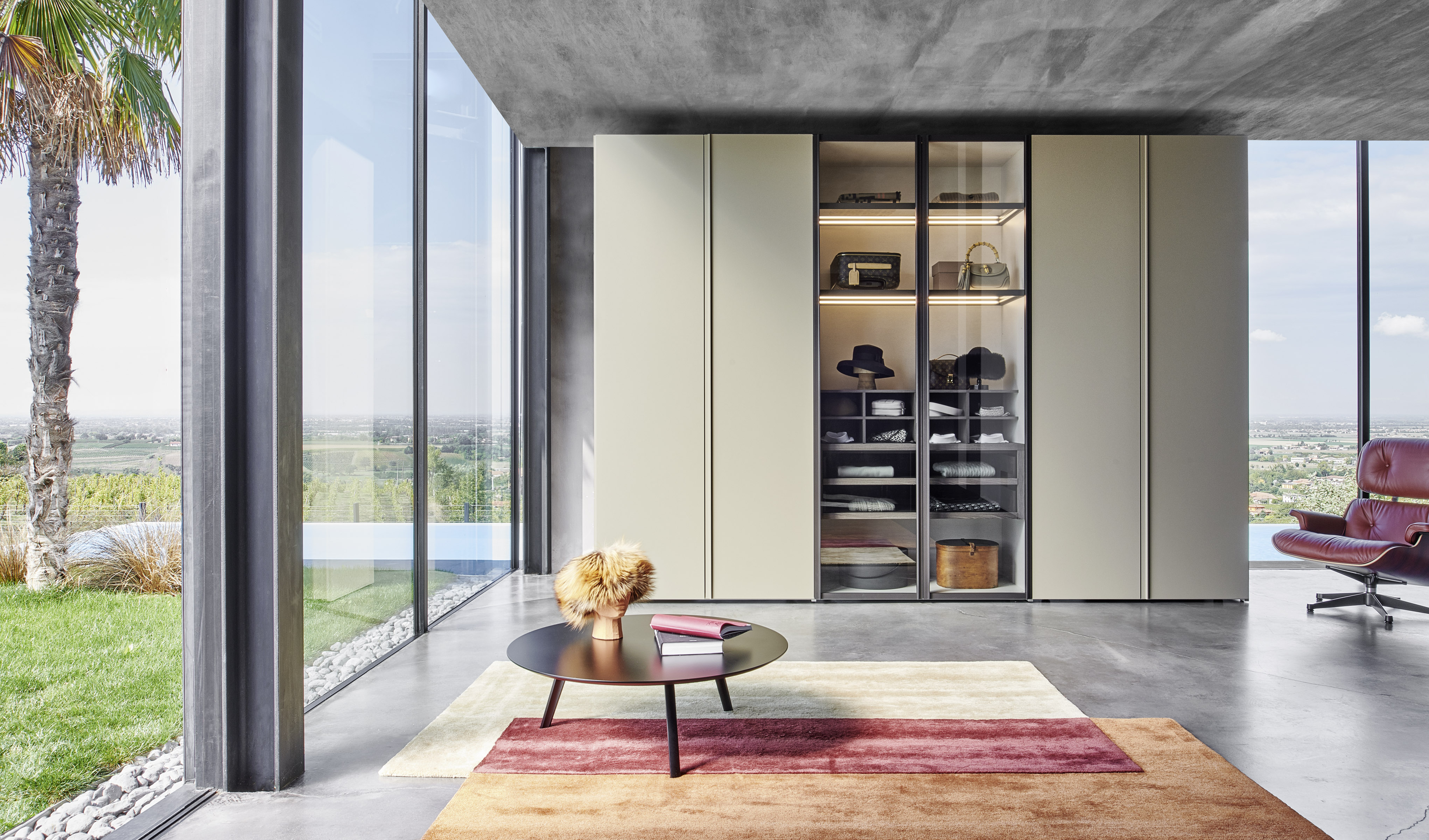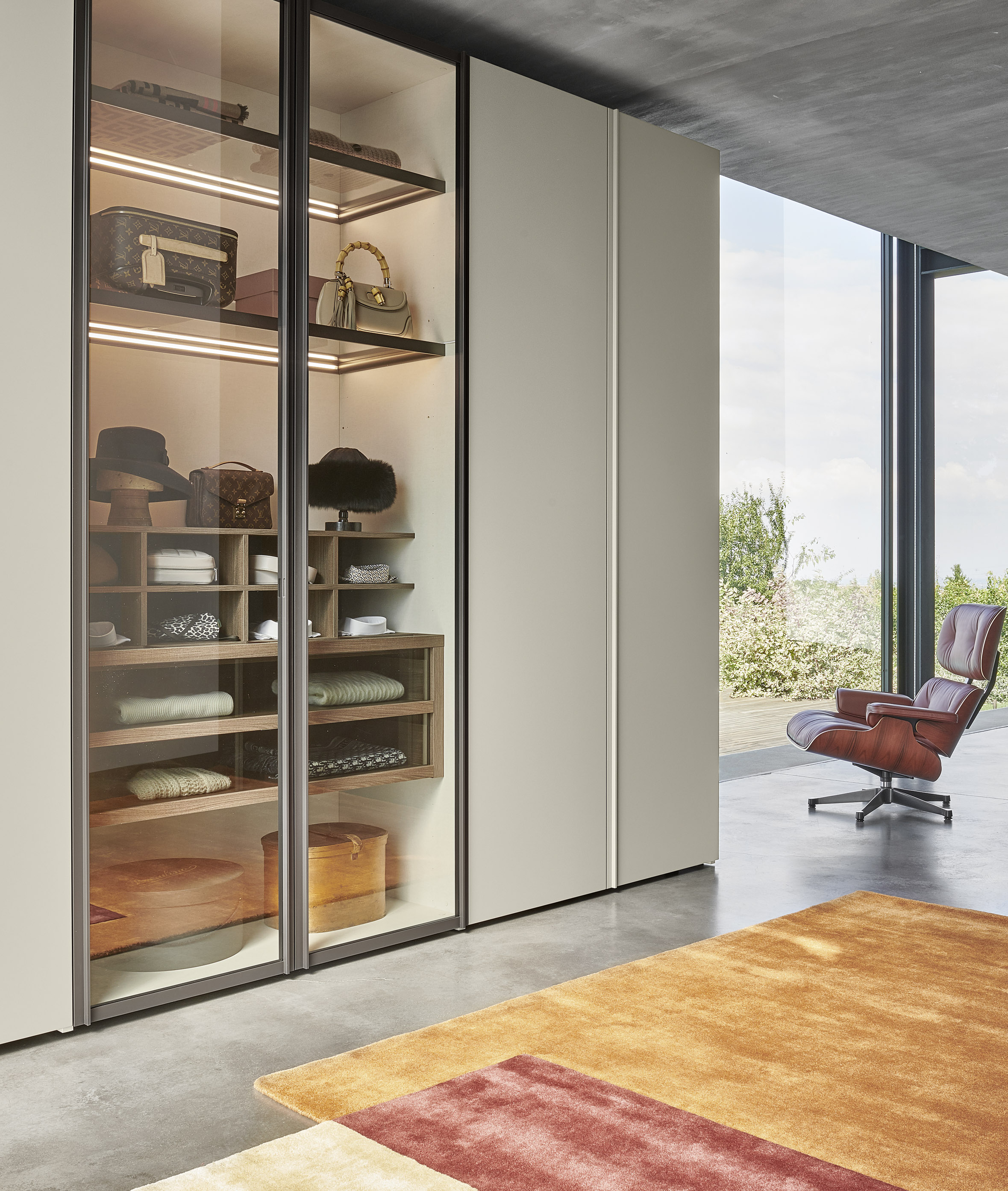 Scrigno can take the form of a classic wardrobe or transform into a storage unit with glass sides and back panels, ideal for creating true display cases within the home. This configuration allows clothes, accessories, and design objects to be showcased with high aesthetic impact.