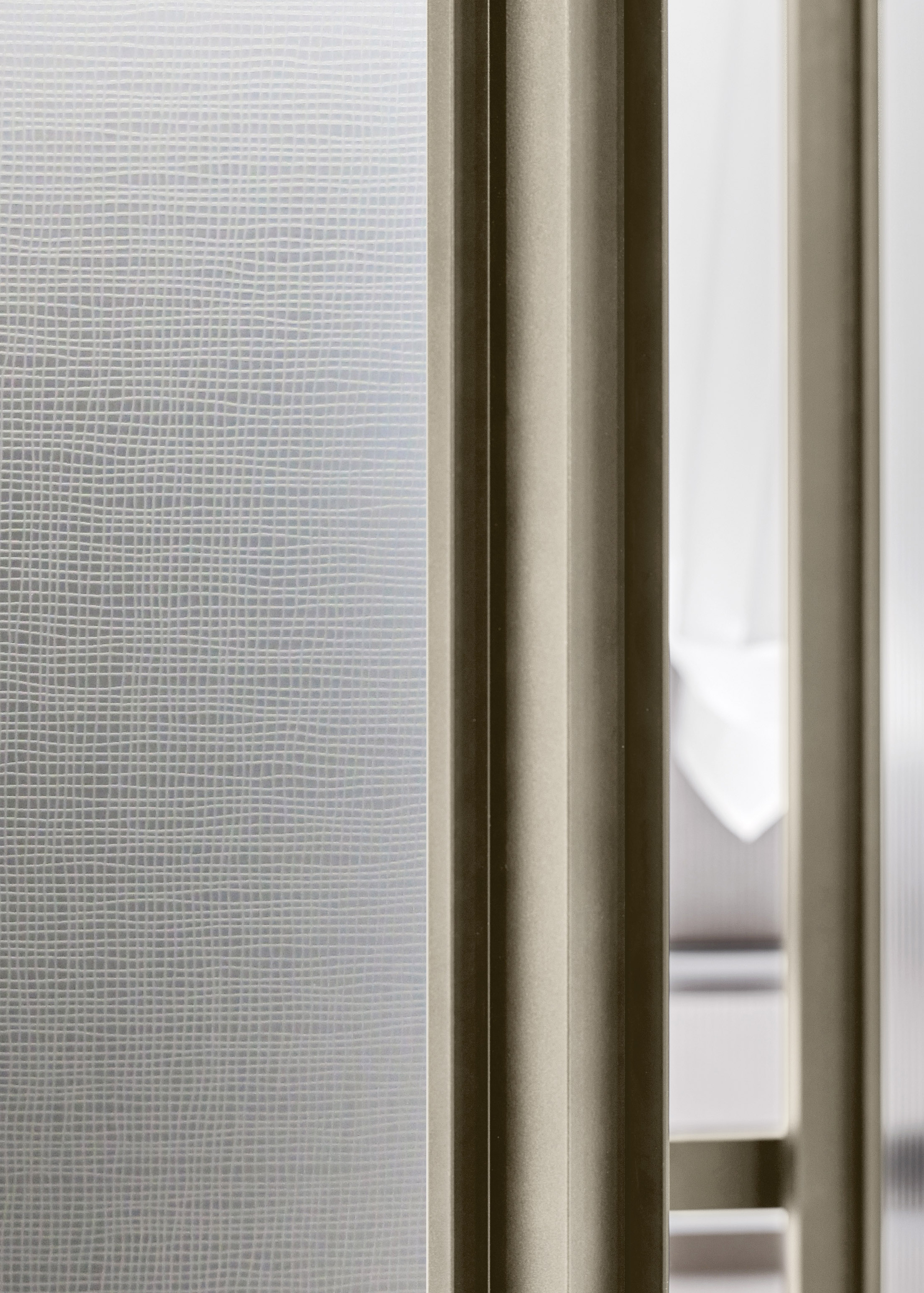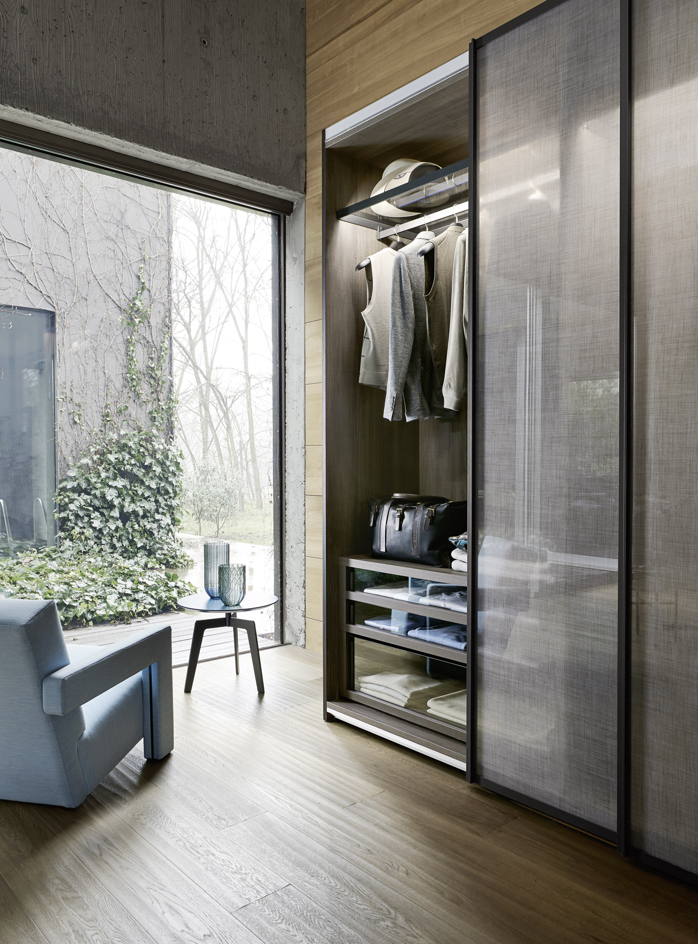 The Scrigno sliding door in glass features a semi-transparent weave similar to fabric and is framed by a metal profile in a Brown finish: for a precious wardrobe, just like a high-fashion boutique.