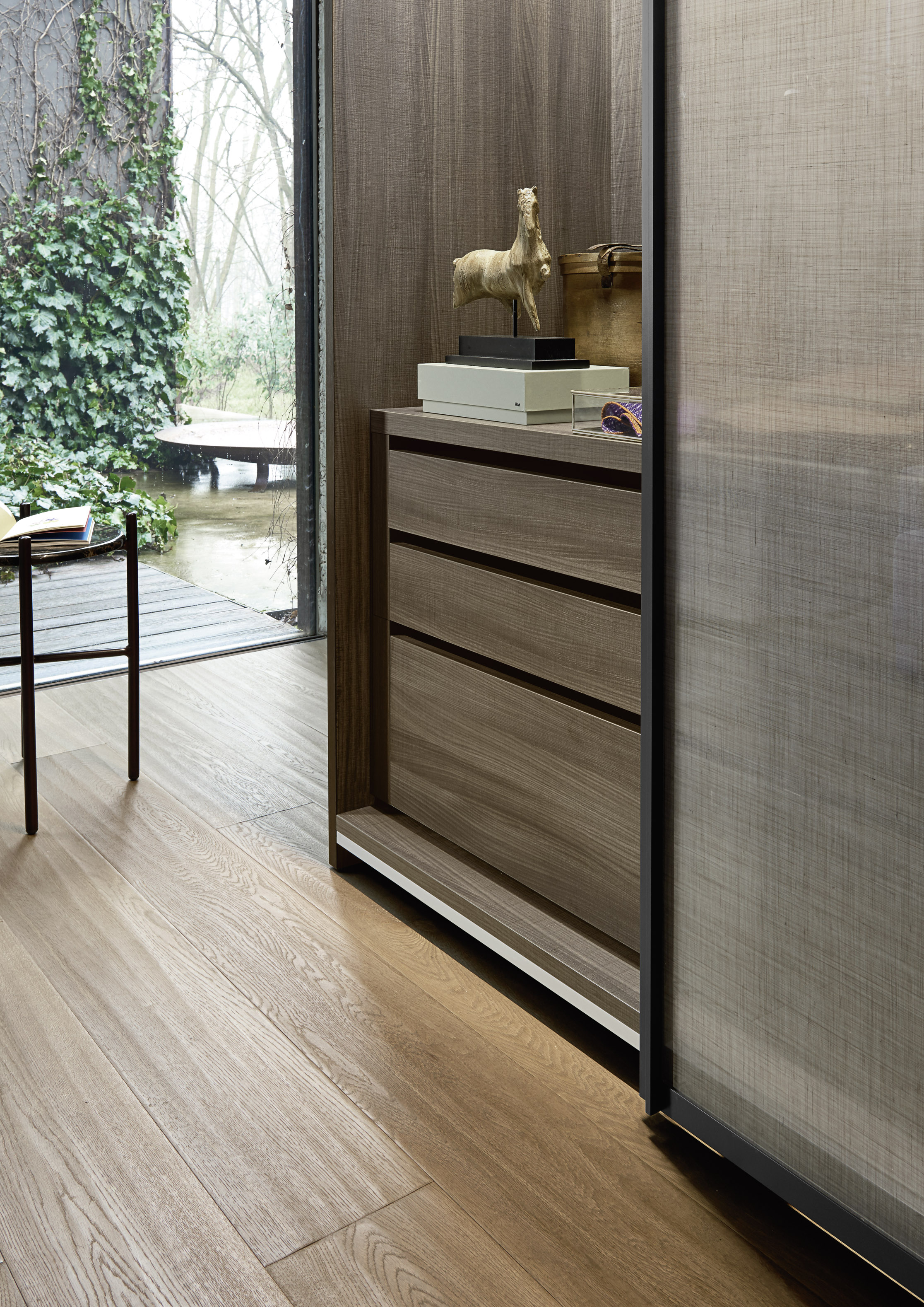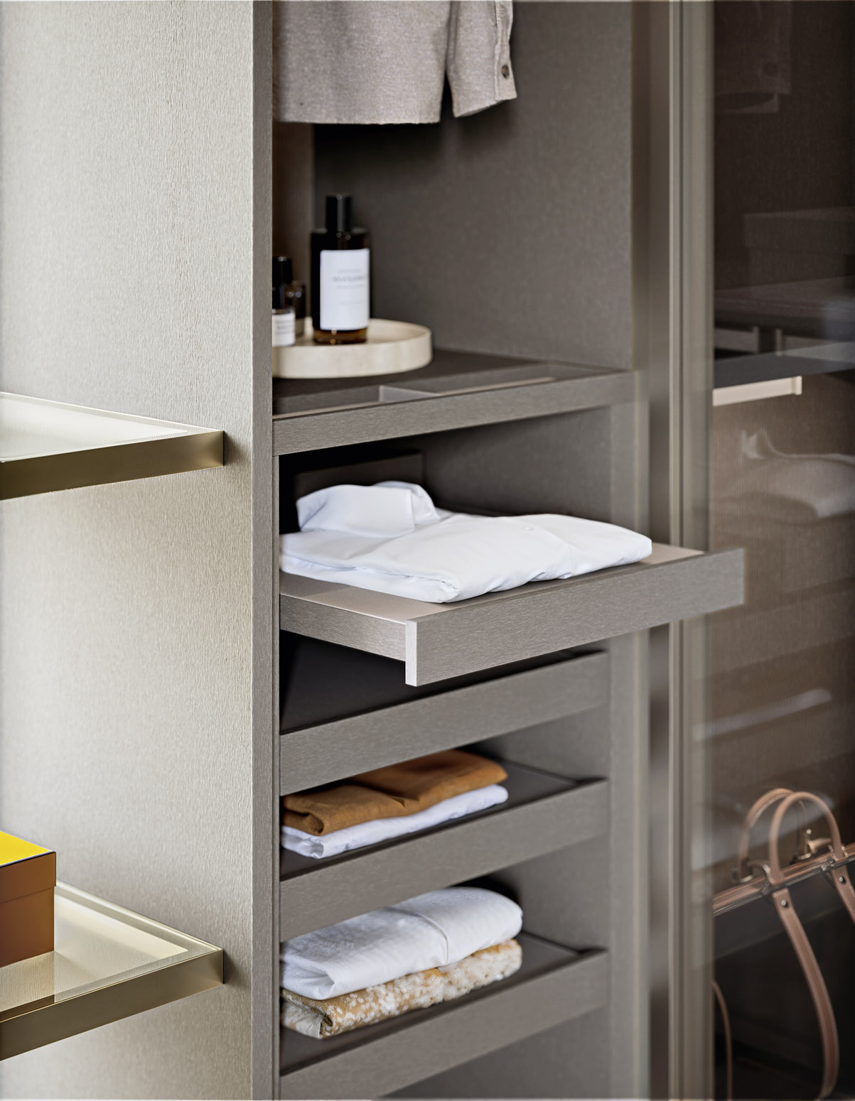Glass shelves create an enveloping atmosphere, enhanced by functional integrated lighting and drawer units in wood or with glass fronts. Scrigno is the ideal furnishing element for a sleeping area with a bold character, creating a suggestive and welcoming ambiance through sophisticated design details.