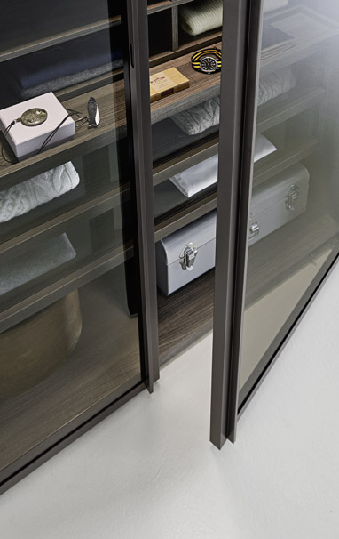 Scrigno is a refined and functional furniture system that features both hinged and sliding doors, designed with painted metal frames available in elegant Brown, Piombo and Palladio finishes. The doors can be completed with glass in various finishes, thus offering endless customization possibilities.