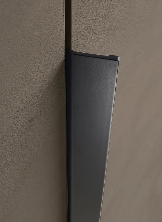 Assisa: A Vertical Statement for Refined Interiors The Liscia plain door can be paired with the Assisa handle, a vertical metal detail available in a sophisticated range of finishes: from the classic brilliance of polished brass to the timeless elegance of bronze. This hardware choice adds a touch of luxury, transforming the wardrobe into a high-end design feature.