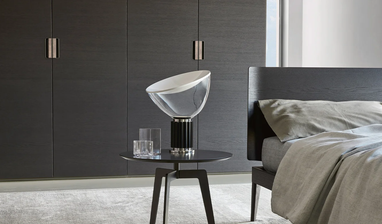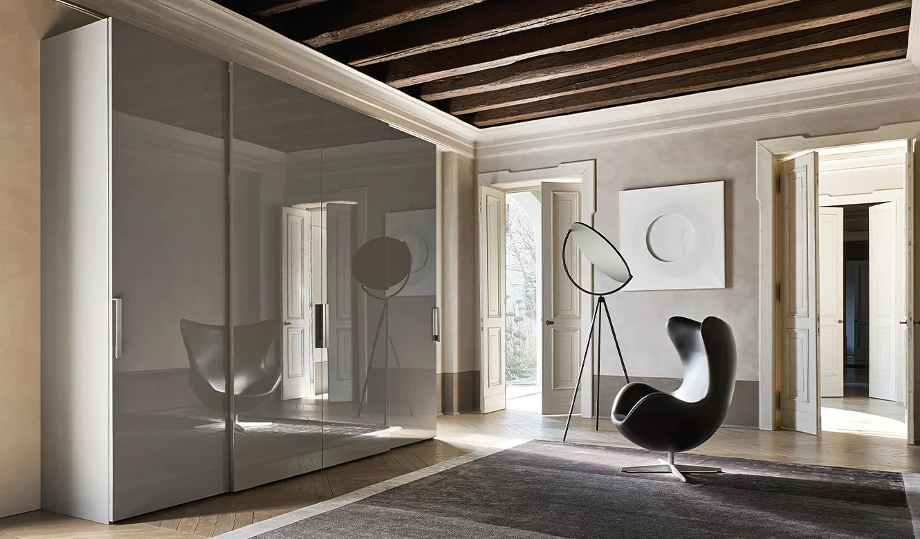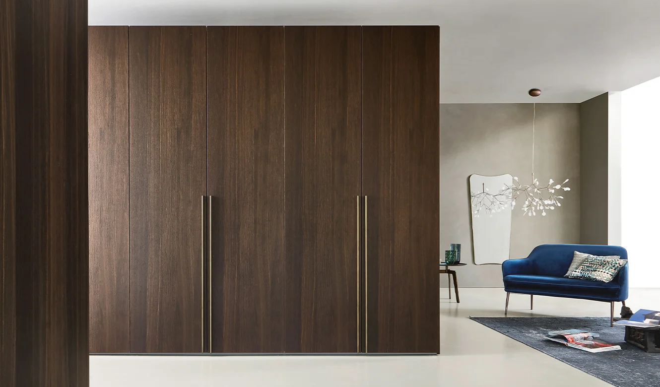 Liscia opens with a gesture and reveals its interior, a dark Elm wardrobe: a perfectly organized universe, equipped with accessories including luminous shelves, clothes rails, wooden and glass drawer units, and other accessories. The bifacial version wardrobe divides the environment and becomes an architectural element. The large doors are made precious by the reflections of the metal handles. The Liscia wardrobe is available with handles Ala, Skin, Beta, Deluxe and Mia.