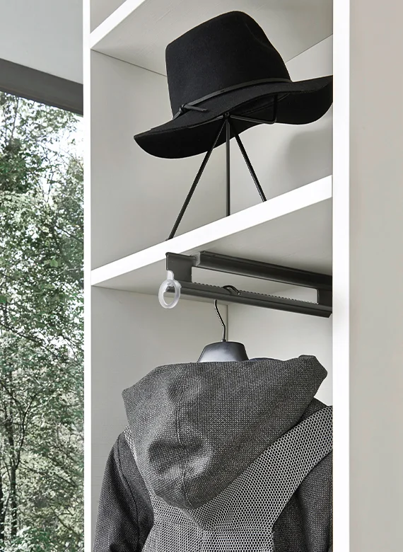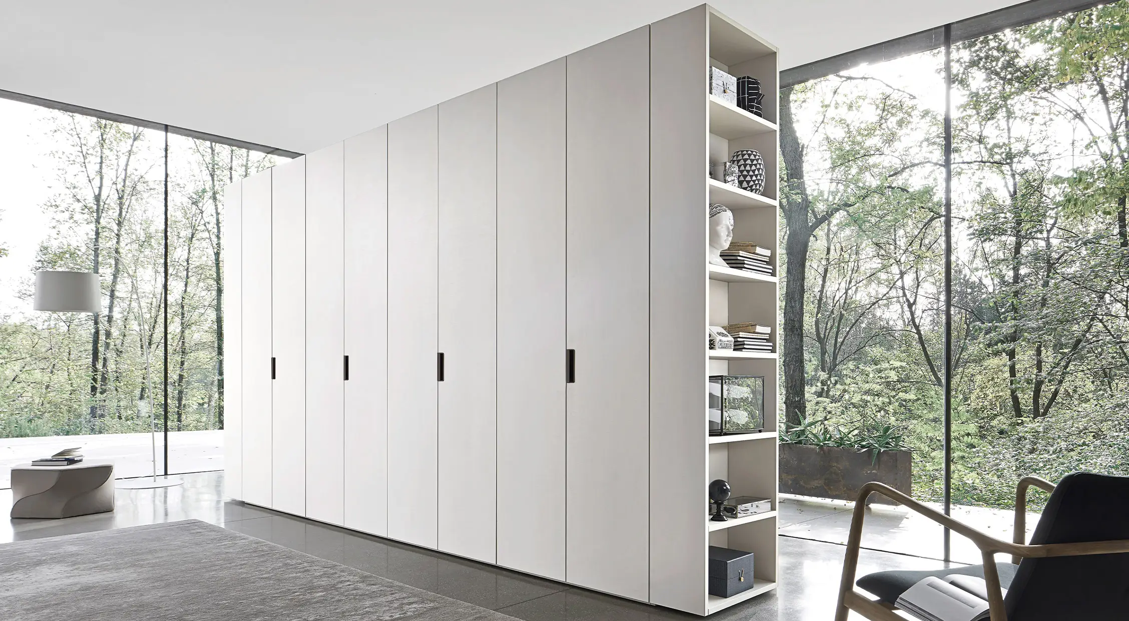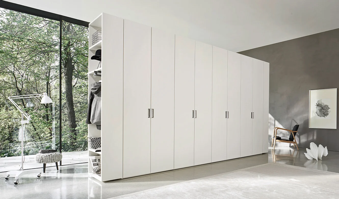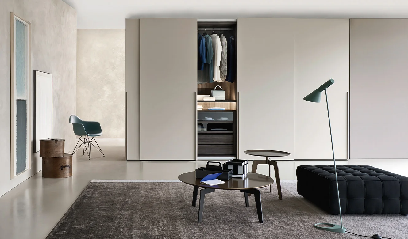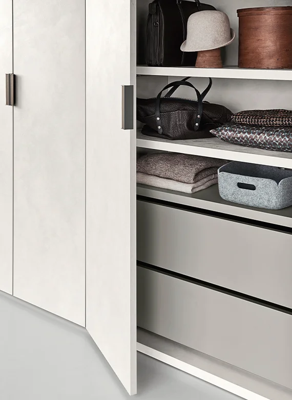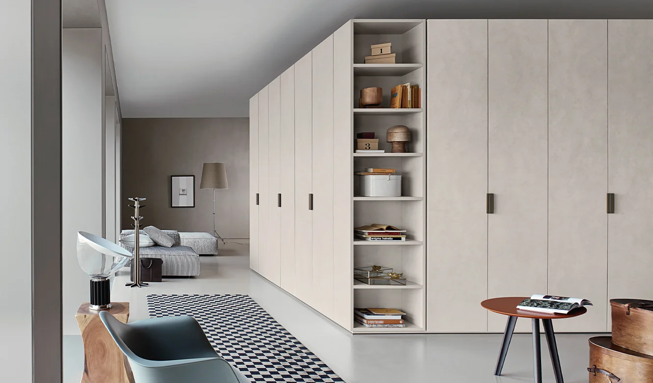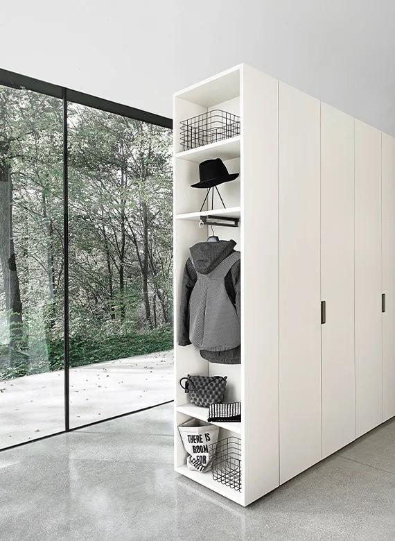 Beta: Seamless Form and Functional Elegance The Liscia plain door is paired with the Beta recessed handle, creating a clean, formal, and highly functional aesthetic. The wardrobe’s side terminal units feature open shelving, perfect for use as a coat rack or storage for personal items. This open-compartment element lightens the visual impact of the double-sided wardrobe, turning it into a functional display for clothing and accessories.