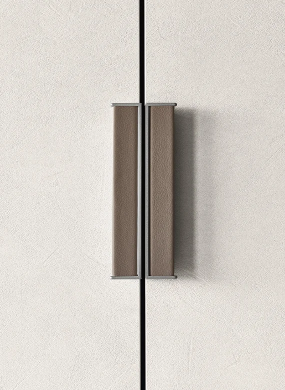 Deluxe: The Precious Detail of Your Wardrobe The Deluxe handle features a sleek metal core upholstered in eco-leather, eco-vintage, or genuine leather—materials chosen for their exceptional tactile and visual appeal. This refined detail embellishes the Liscia plain door, creating an elegant furniture statement that elevates the entire room.