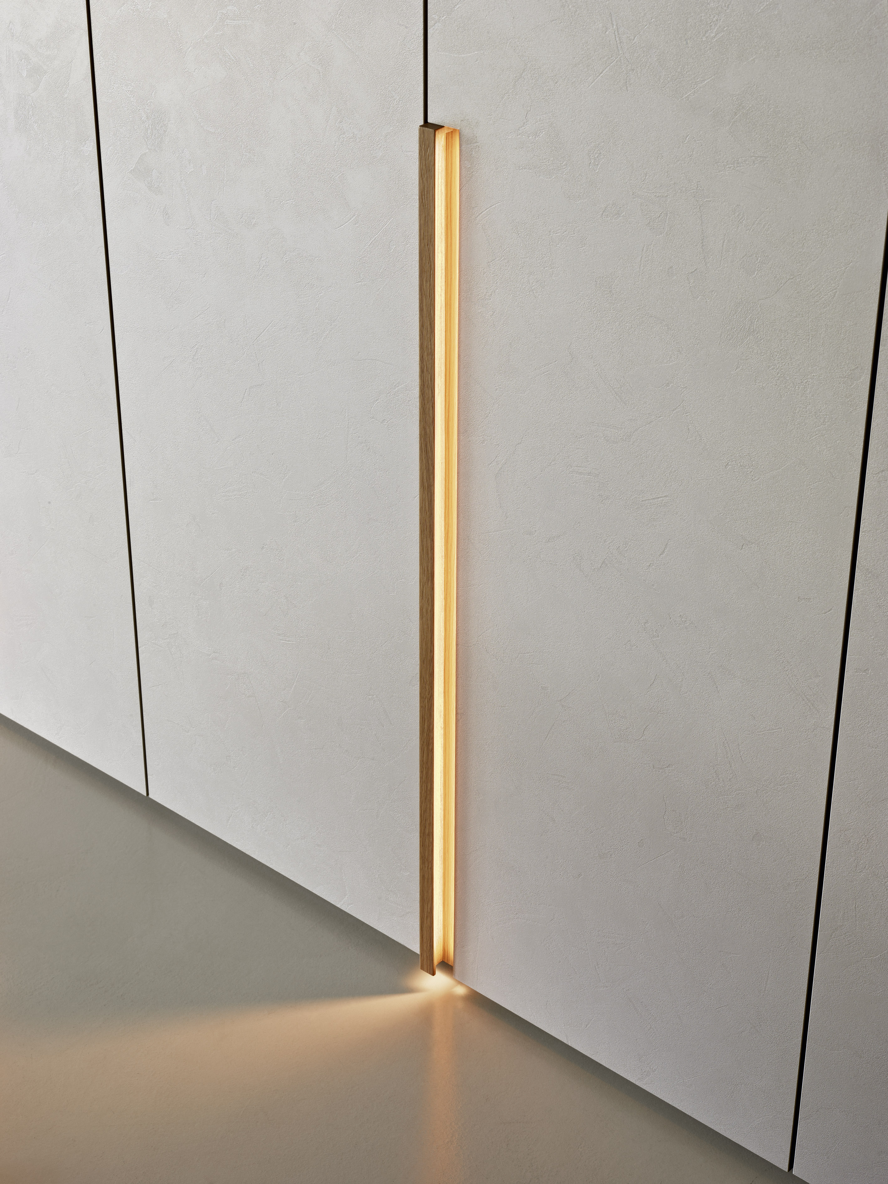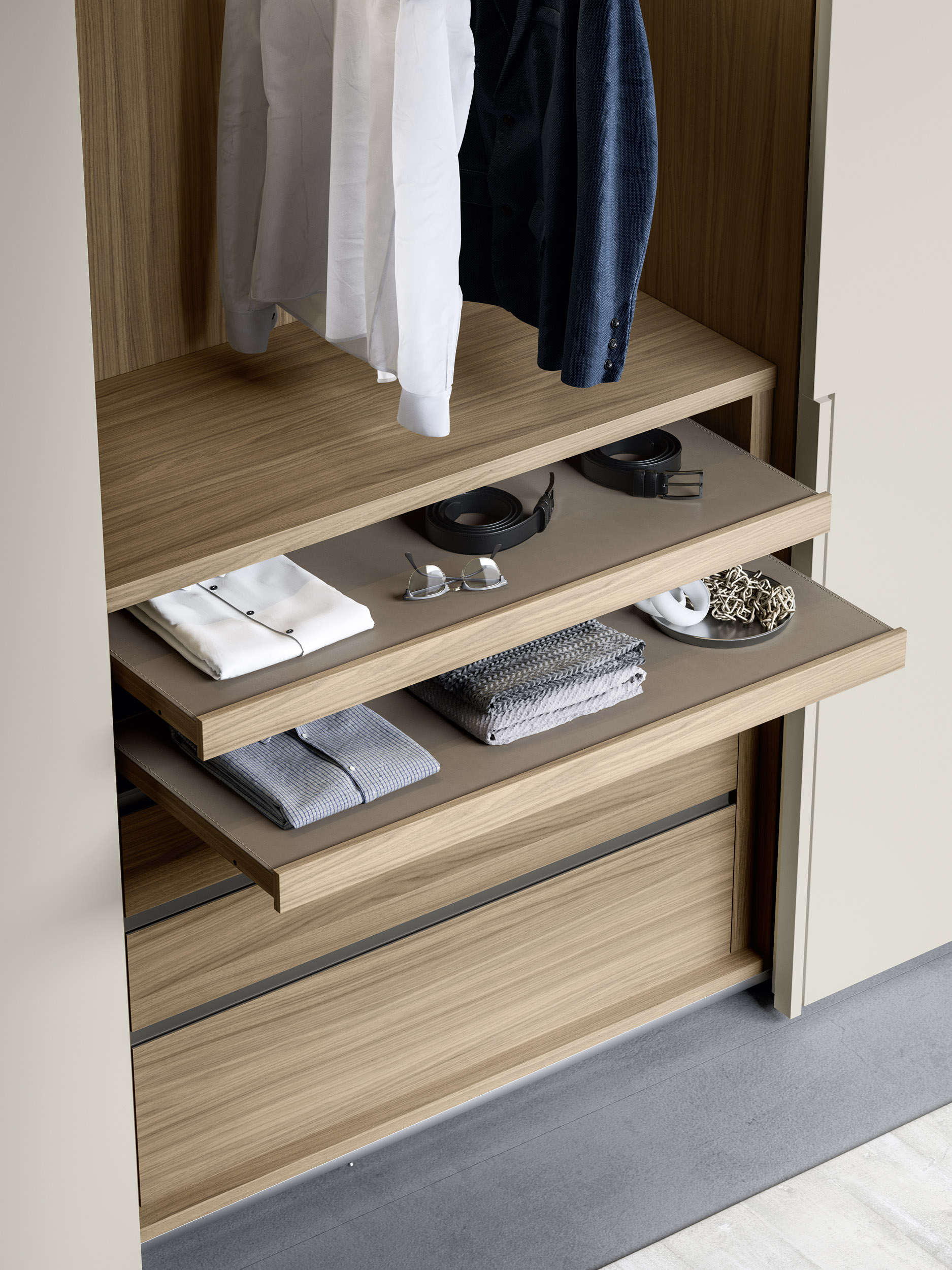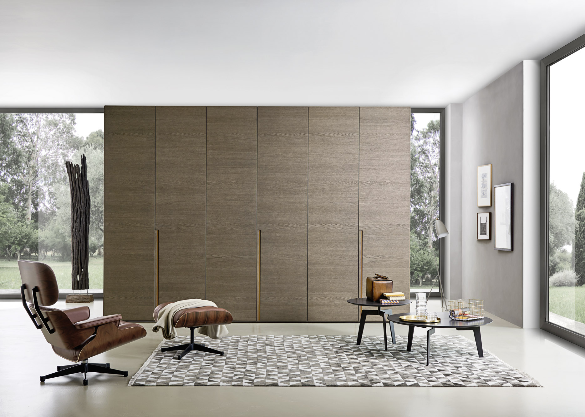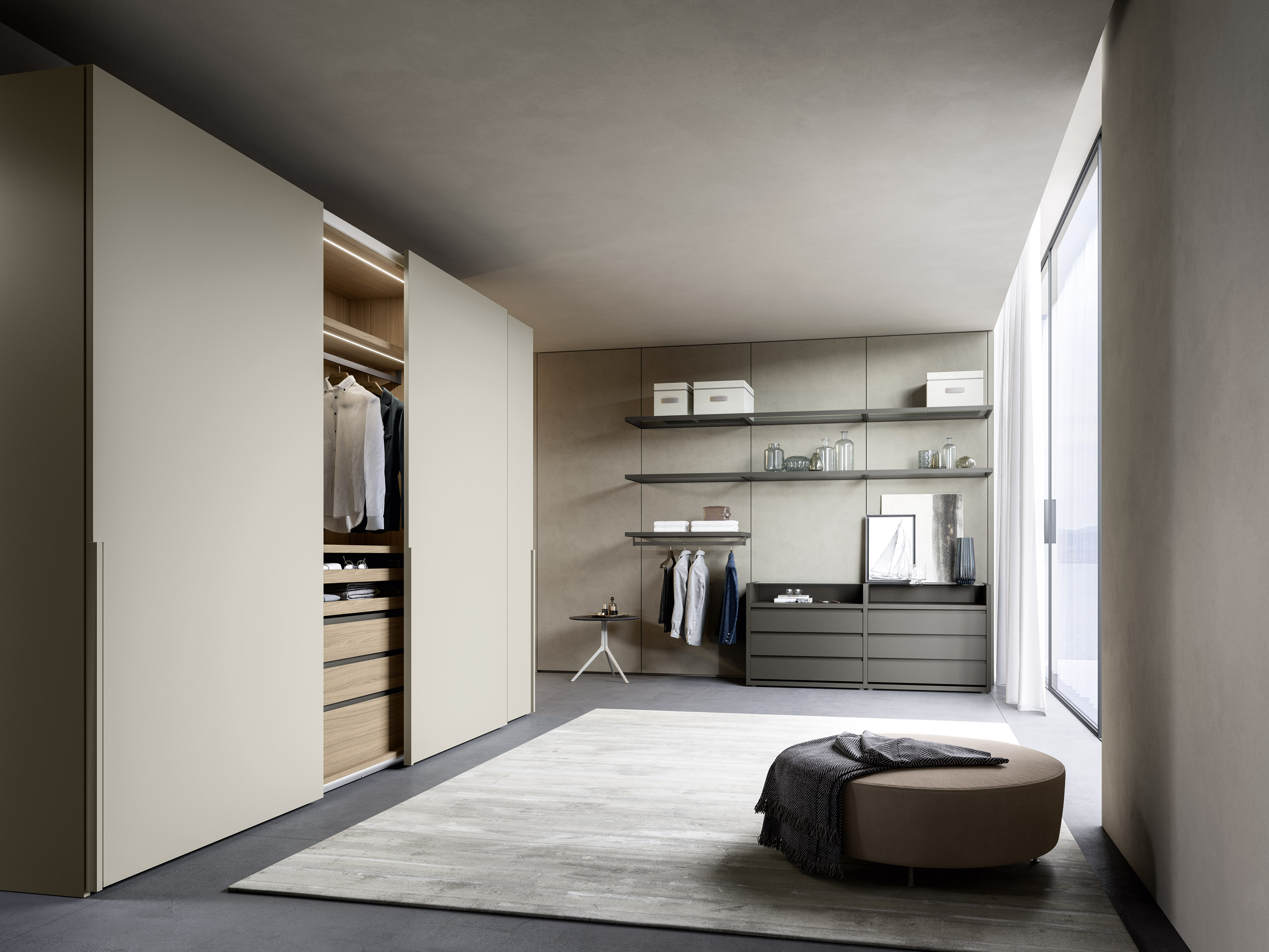 The Tratto wardrobe is distinguished by materials and details that never leave anything to chance: the handle can be crafted in the same finish as the door, or in contrast, while the color of the band's bottom can be coordinated with the chest of drawers and internal shelves for an elegant final effect with a minimalist design.